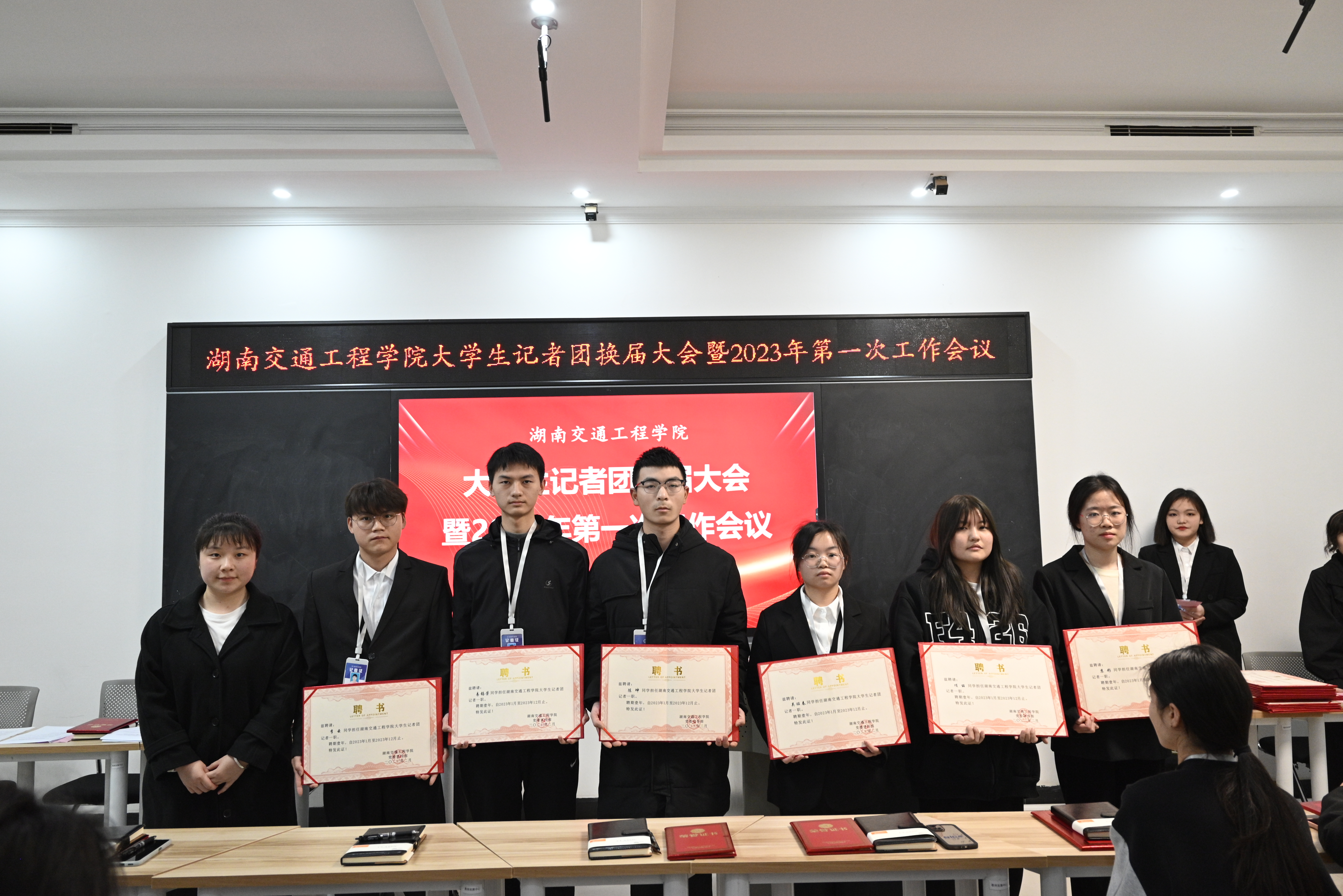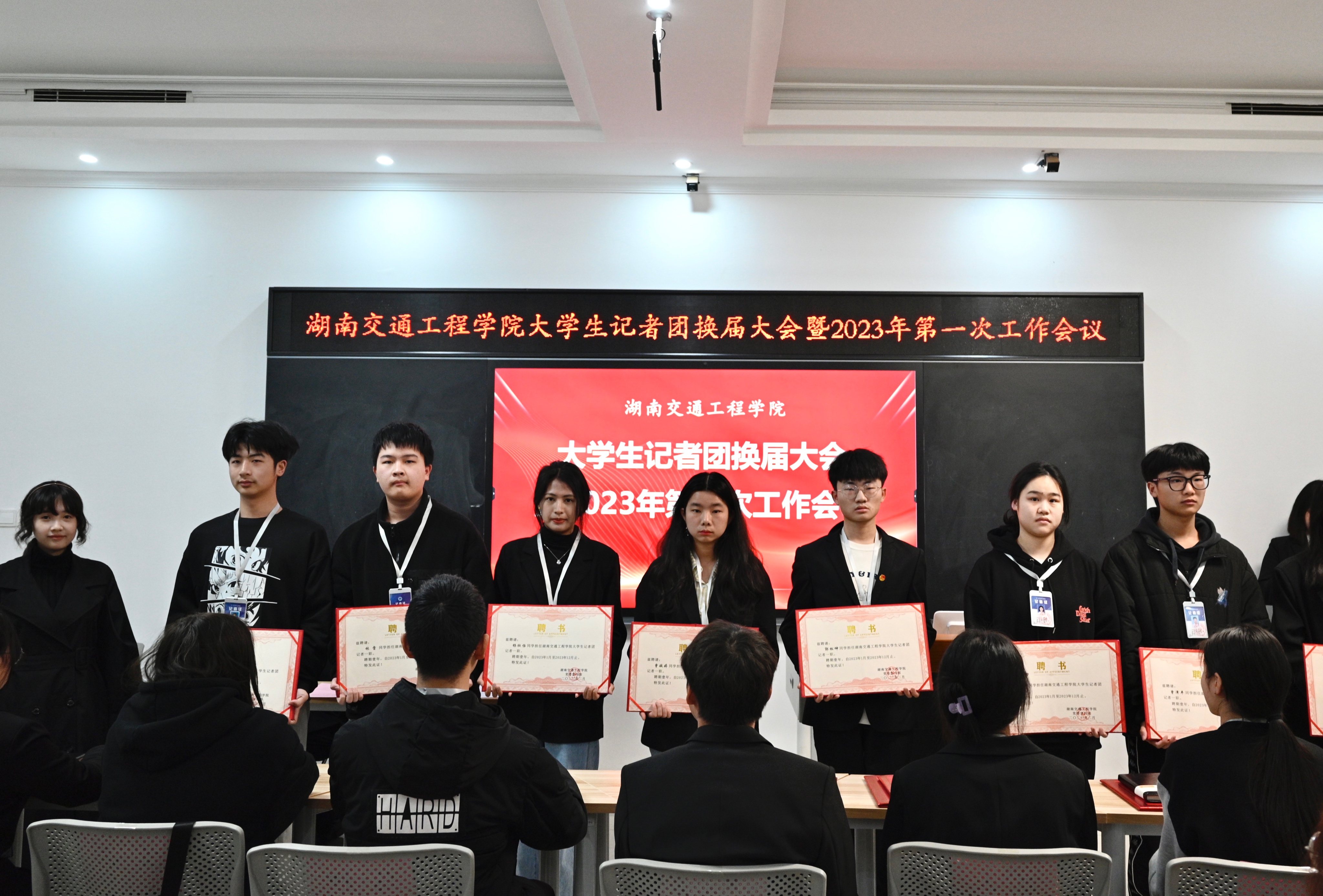 李建华宣读了《关于聘任易石基等31位同学为beat365手机版官方网站大学生记者团第二届记者及相应职务的通知》。宣传部范睿庭、胡雅兰、刘心雨3位老师为24名大学生记者颁发了聘书和记者证;李建华为大学生记者团部长颁发聘书和记者证;赵红深为大学生记者团正副团长颁发聘书和记者证。接着,全体大学生记者举起右手就校园新闻工作集体宣誓。