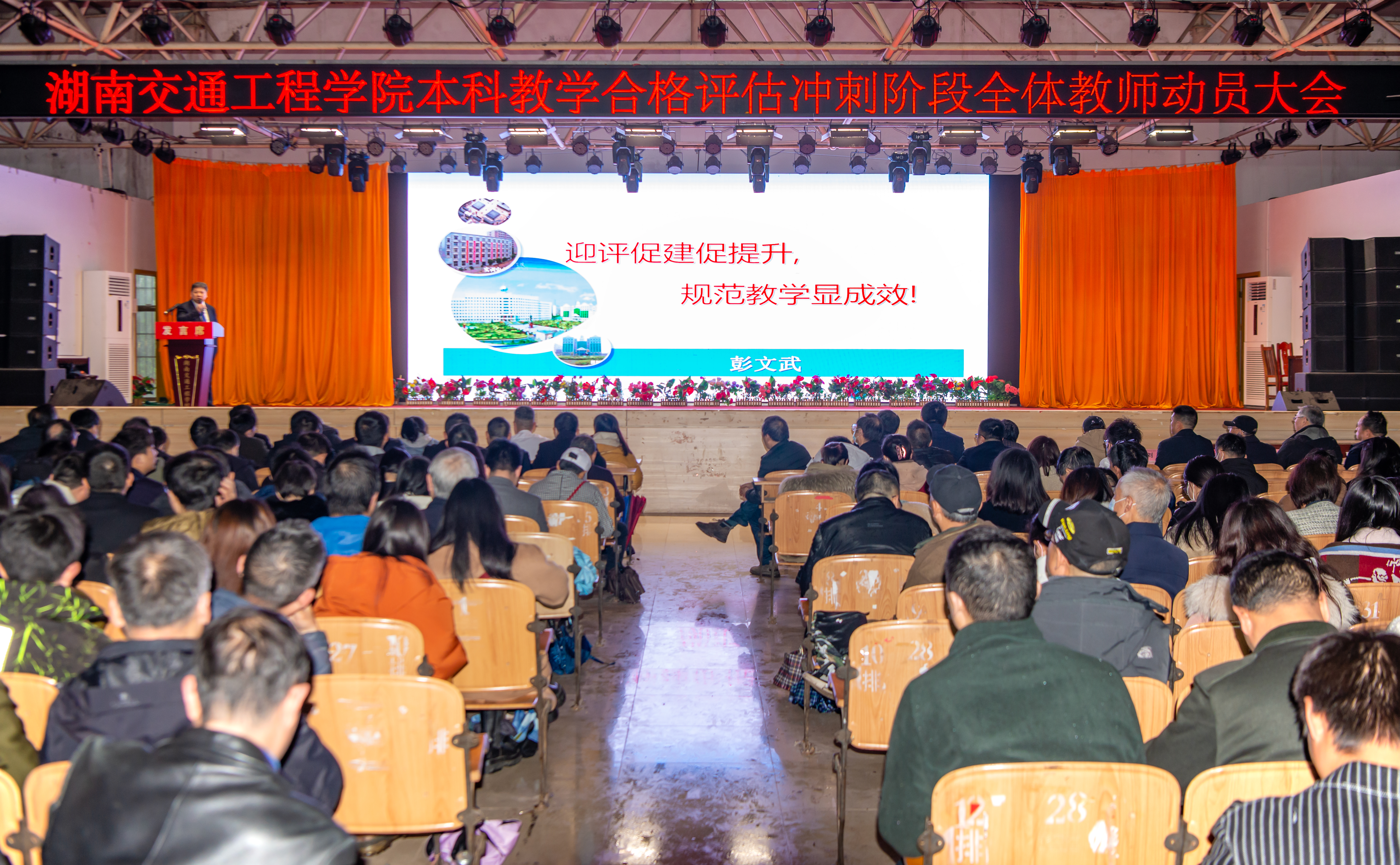 会上,常务副校长彭文武以《迎评促建促提升、规范教学显成效》为题进行了迎评工作部暑。他从“本科教学工作合格评估的主要特点”“前一阶段教学工作存在的主要问题”“学校近期教学工作重点”三个方面进行了阐述。对自评工作中专家组成员对我们教师工作提出的意见和建议进行了通报和分析。特别指出了自评过程中评估专家反映的beat365部分教师课堂教学表现的教学水平问题, 试卷分析和毕业论文(设计)指导中工作责任心方面存在的突出问题。他在近期教学工作重点中指出,重申教师教学规范, 强化认真备课磨课, 落实整改工作任务,提升教学工作状状。他要求下一步的工作中要加强督导,及时问责;尽快启动全体教师教学水平诊断和培训工作;加强教师教学水平,提高教师课堂质量,提升教师的责任心。彭文武强调每个老师都是在自己的岗位上“守土一方 ”,自己坚守好自己的阵地。