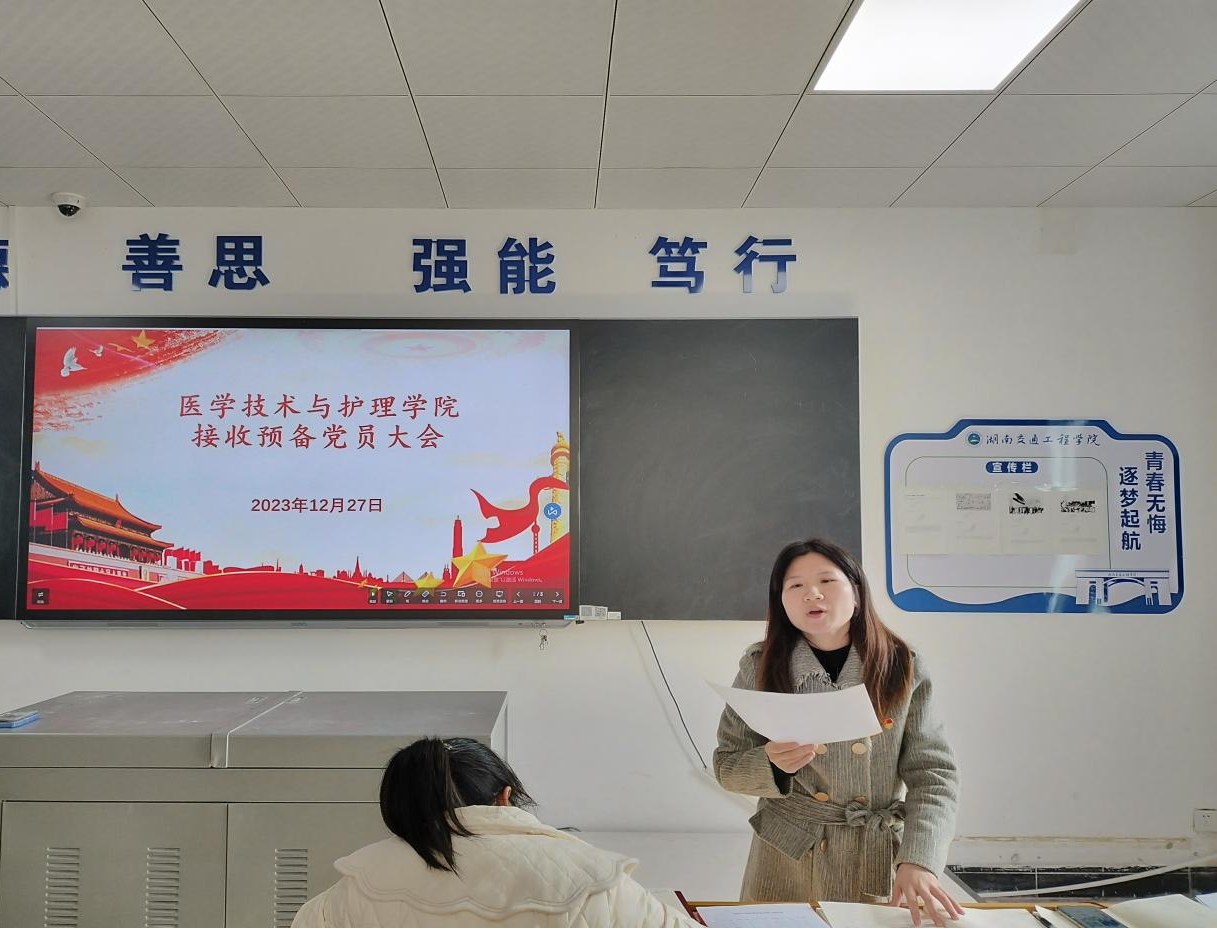 2023年12月27日中午,医学技术与护理学院党总支在教学楼203教室召开2023年下半年预备党员接收大会。医护学院党总支书记邓丽、副书记兼团总支书记肖桂香、教工党支部书记廖小立、学生党支部书记贺九芳,全体在校党员以及15名拟发展对象参加了本次会议。会议由贺九芳主持。