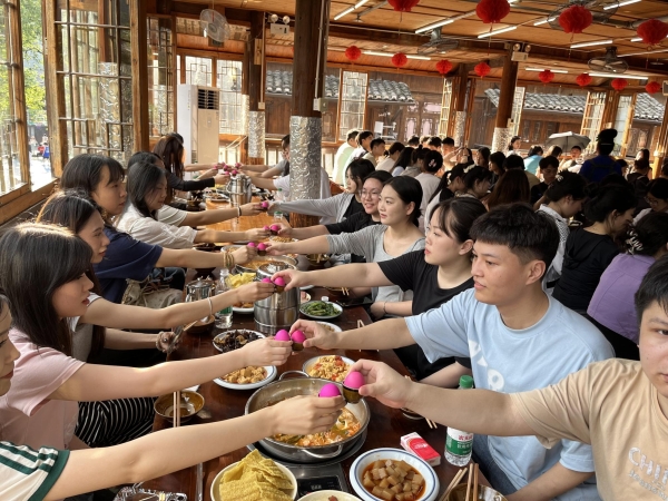 ▲师生在西江千户苗寨风雨桥品尝长桌宴