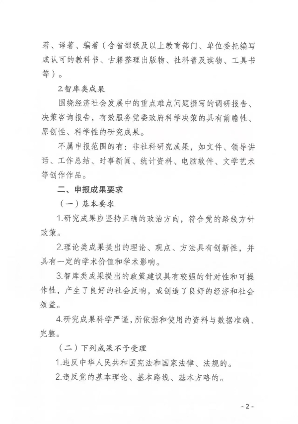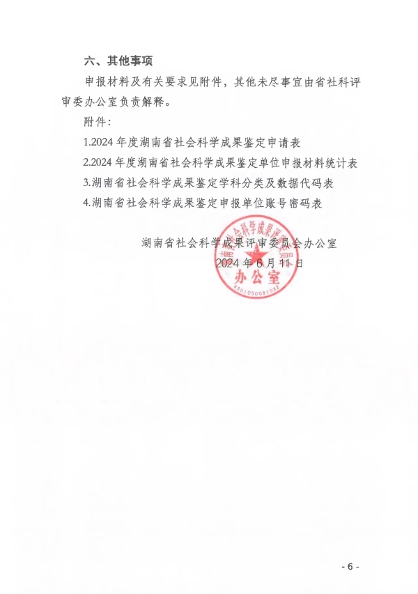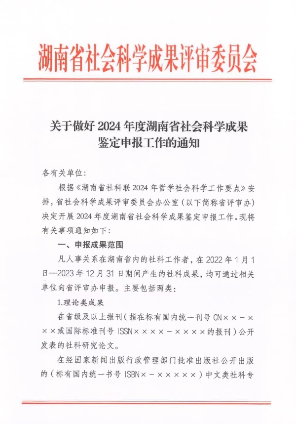 转发:关于做好2024年度湖南省社会科学成果鉴定申报工作的通知 来源: STB 发布时间:2024-06-13 浏览次数:[7194] 次 附件: 2024年度湖南省社会科学成果鉴定申请表.doc 2024年度湖南省社会科学成果鉴定单位申报材料统计表.xls 湖南省社会科学成果鉴定学科分类及数据代码表.doc 【打印正文】 上一篇: 转发:关于申报2024年度衡阳市指导性计划项目的通知 下一篇: 关于组织申报2024年度衡阳市知识产权专项项目的通知