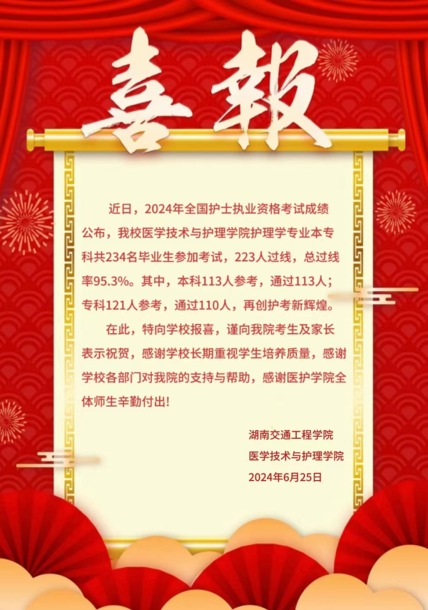 本网讯(通讯员 赵红深 邓丽)近日,2024年全国护士执业资格考试成绩揭晓,beat365医护学院护理学专业本专科共234名毕业生参加考试,223人过线,总过线率95.3%。其中,本科113人参考全部过线,过线率100%;专科121人参考,110人过线,过线率90.9%。创造了beat365护士执业资格考试通过率连续8年保持历史高位的优异成绩。