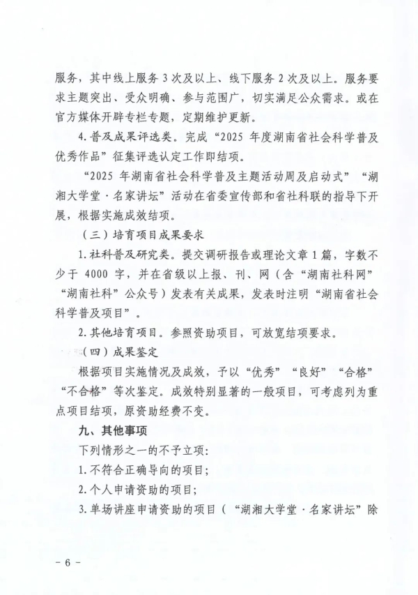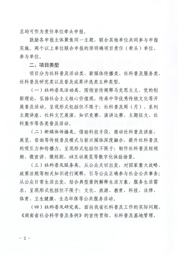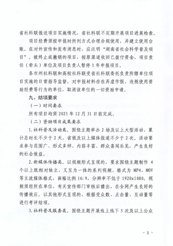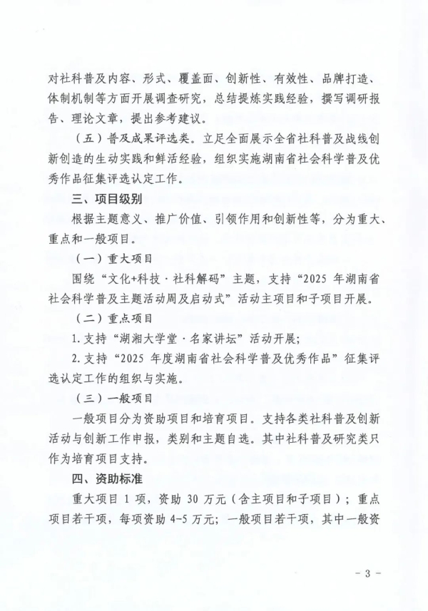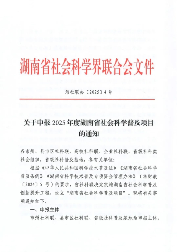 转发:关于申报2025年度湖南省社科普及项目的通知 来源: STB 发布时间:2025-03-15 浏览次数:[2070] 次 附件1:2025年度湖南省社会科学普及项目选题指南.doc 附件2:2025年度湖南省社会科学普及项目申报书.doc 附件3:2025年度湖南省社会科学普及项目申报汇总表.doc科技处2025年3月15日 【打印正文】 上一篇: 关于申报2025年湖南省高校思想政治工作精品项目的通知 下一篇: 关于申报2025年度教育部人文社会科学研究一般项目的通知
