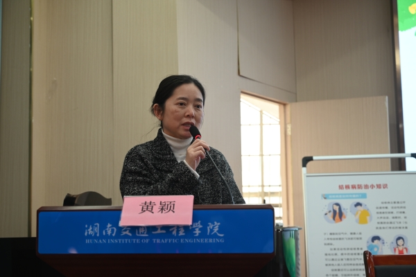 本网讯(通讯员 赵红深 摄影 胡子婷)为普及结核病防治知识,提高全校师生员工健康保护意识,加强学校结核病防治工作。3月20日下午,学校在航母楼一楼报告厅举行以“全面行动 全力投入 全民参与 终结结核”为主题的2025 年春季结核病防治知识讲座。本次讲座特邀湖南省防痨协会结核病控制专委会常务委员、衡阳市医学会传染病及结核病专委会副主任黄颖主任医师主讲,全校师生员工及食堂门店从业人员参与。采取线上和线下同步进行,各班级教室设置线上分会场。