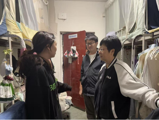 走访过程中,刘敏芝书记与辅导员们与学生面对面交流。从“最近课程压力大不大”“食堂饭菜合不合口味”等生活细节,到“未来职业规划有没有方向”“是否需要心理疏导支持”等成长困惑,辅导员们耐心倾听、细致记录,用真诚对话拉近与学生的距离。同时,为保障学生住宿安全,学院辅导员还重点开展大功率电器排查工作,向学生详细讲解违规用电的安全隐患,引导学生树立“安全第一”的住宿意识。