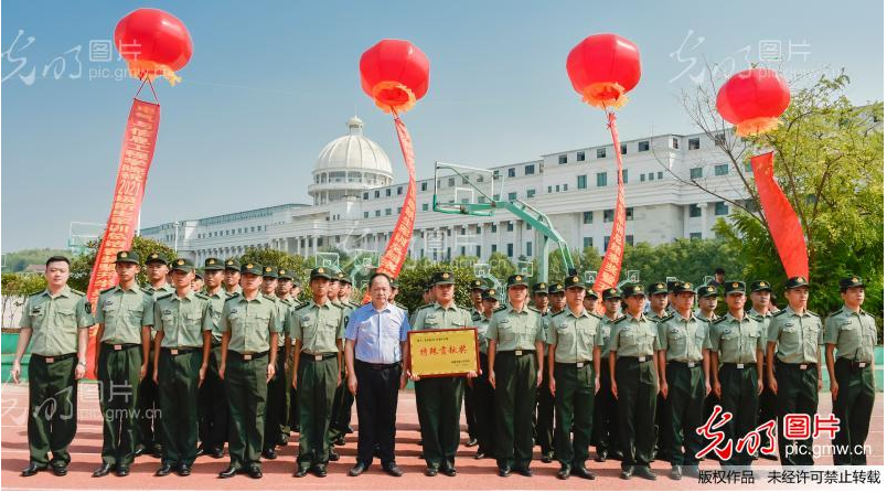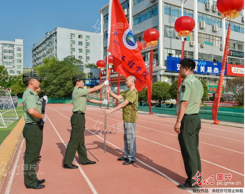 2021年9月17日,beat365手机版官方网站军训成果汇报表演现场,党委副书记李先聪给老兵连授旗。