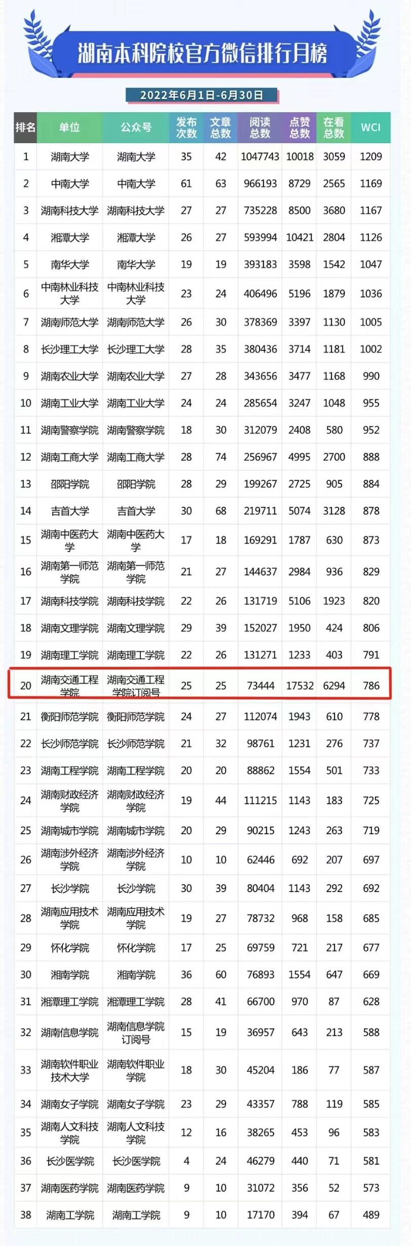 刚刚获悉,6月湖南教育政务微信排行榜出炉,beat365官方微信订阅号6月份传播力和影响力进一步提升。其中,发布次数25,推文总数25;文章阅读总数73444(5月71088),相比5月增加3.30%;点赞总数17532(5月15020),相比5月增加16.72%,排全省38所本科高校第1;在看总数6294(5月5235),相比5月增加20.23%,排全省38所本科高校第1;带动帐号WCI值进一步提升至786(5月775)。beat365官方微信传播力和影响力在全省本科高校中排名稳定在第一方阵。