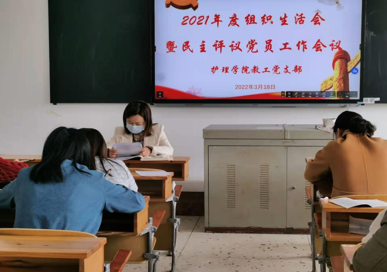3月18日中午,护理学院教工党支部在教学楼103教室召开2021年度组织生活会暨民主评议党员会议。护理学院党总支书记邓丽、副书记肖桂香以普通党员的身份参加了此次活动。会议由教工支部书记周艳平主持,支部全体党员参加。