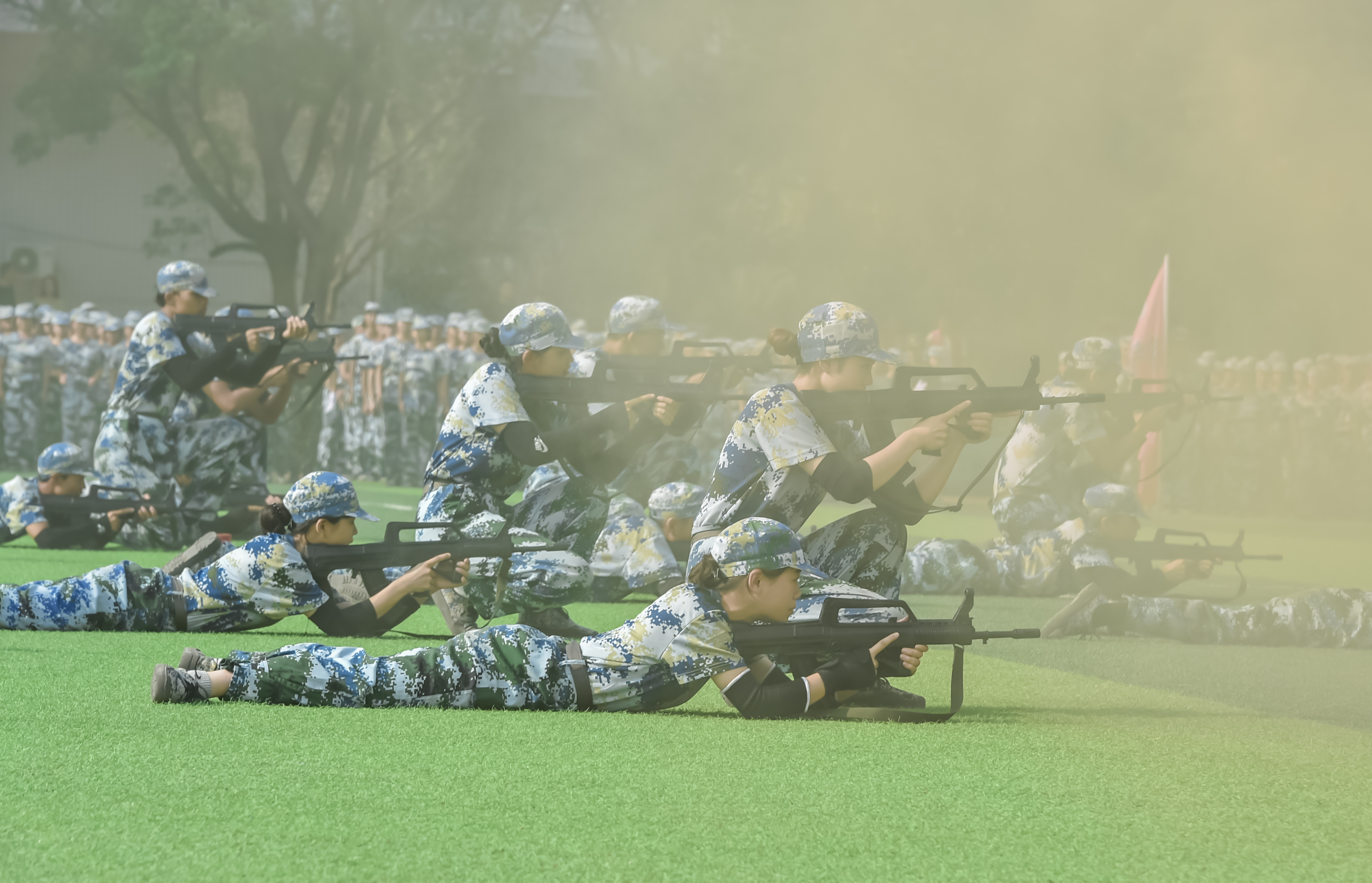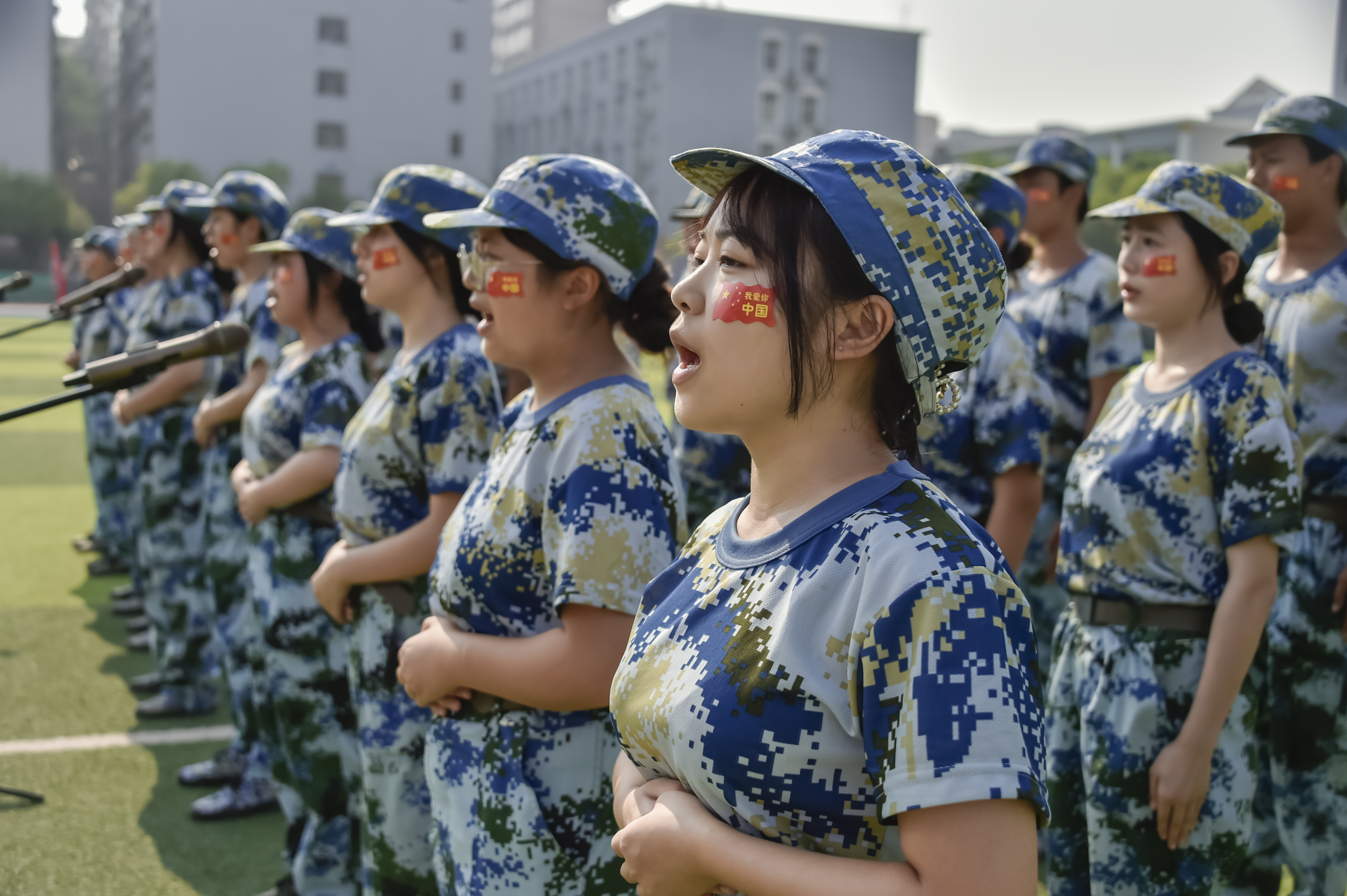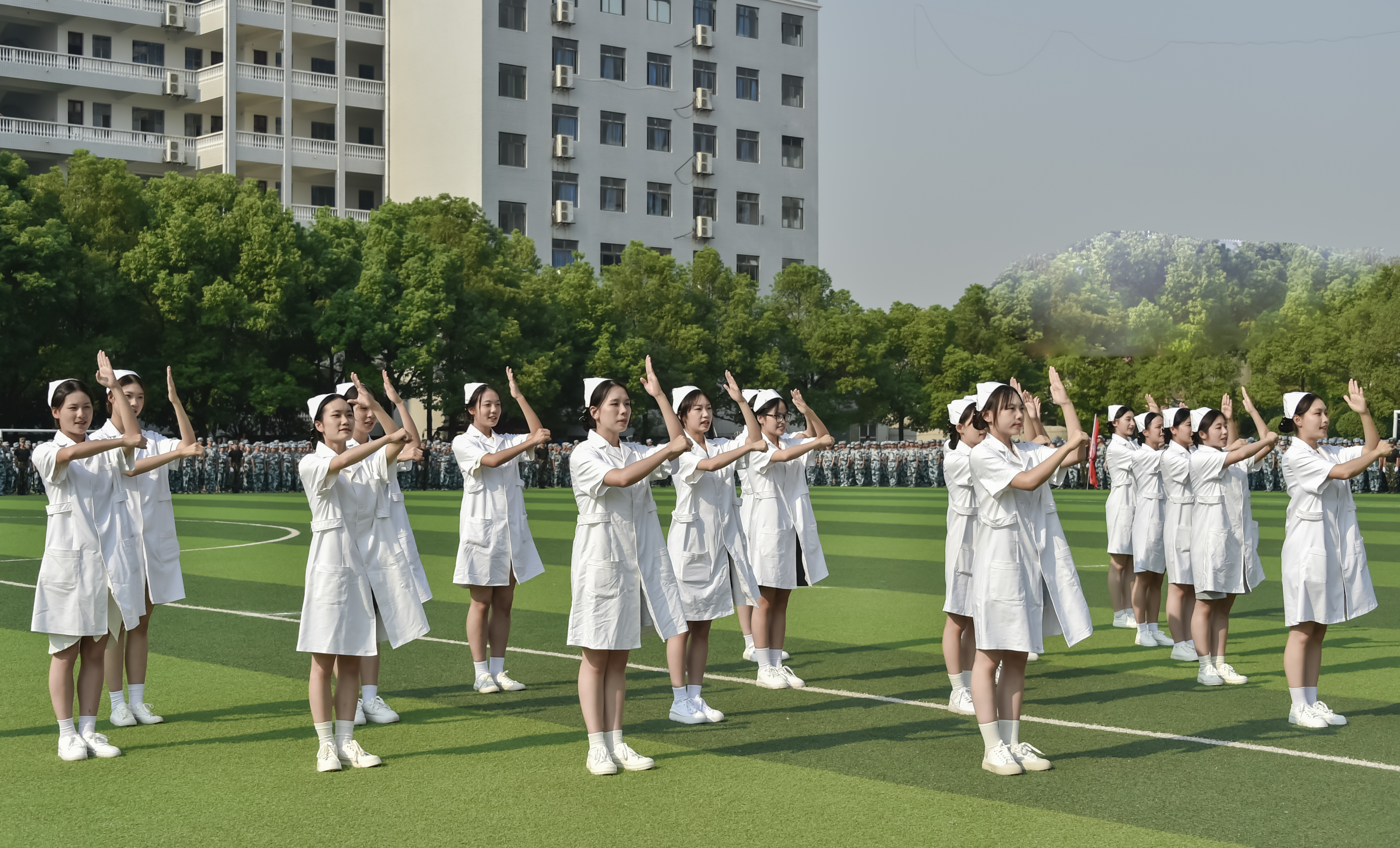 军训汇报大会暨开学典礼在庄严肃穆的国歌声中拉开帷幕。首先进行了军训会操。刘文君给老兵连授校旗后,刘福生检阅了军训团。伴随着雄壮的进行曲,在陈治亚、军训总教官吴桐港的陪同下,刘福生逐一检阅各学院方阵。“同学们好!”“董事长好!”“同学们辛苦了!”“为校争光!”阵阵气势如虹的口号声在操场上空久久回荡。