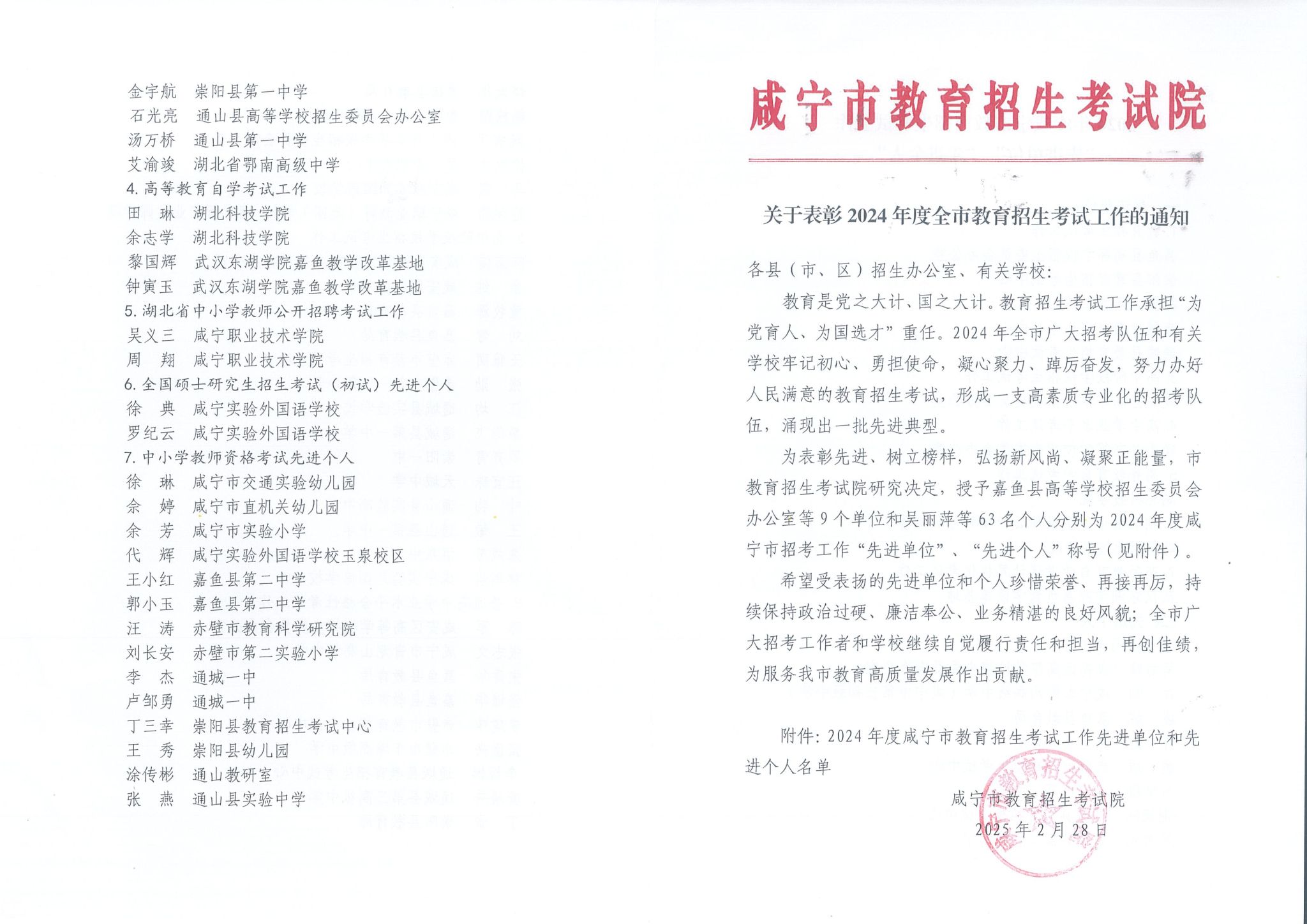 近日,咸宁市招生考试办公室公布了《关于咸宁市2024年度教育招生考试工作及个人评价结果的通报》。LETOU官网凭借规范的管理、优质的服务和良好的考风考纪,获评市教育招生考试优秀考点,LETOU国际米兰官网吴义三、周翔同志获评优秀考务工作者。