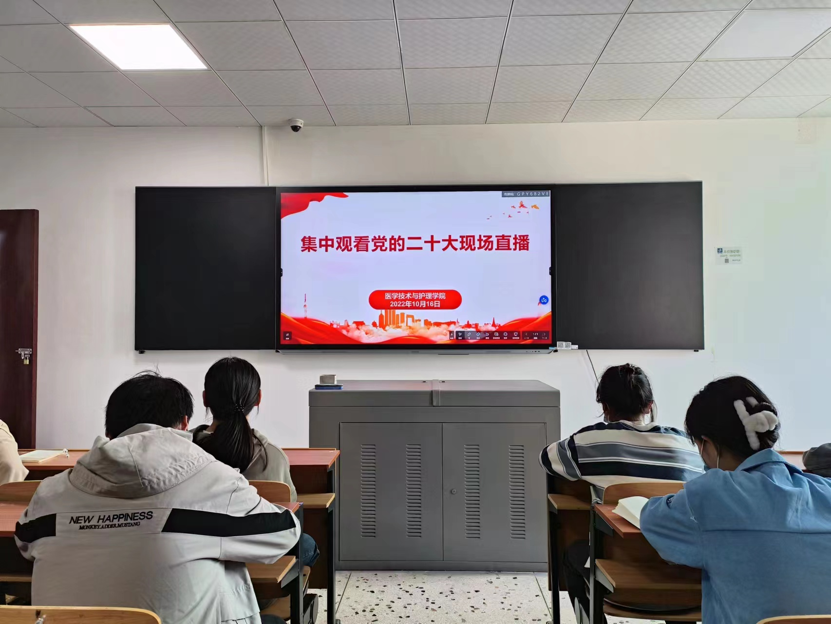 10月16日上午十时,医学技术与护理学院组织全体教师党员、在校学生党员、入党积极分子、学生代表共145人,在教学楼201、203两个教室集中观看中国共产党第二十次全国代表大会开幕式。