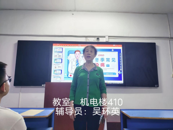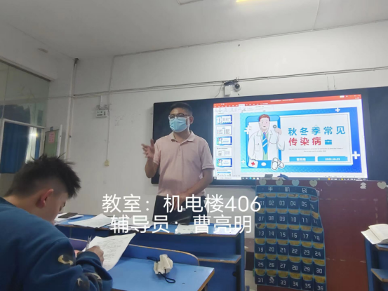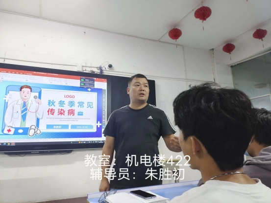 在班会上,各辅导员老师向同学们科普秋冬季节常见传染病、常见疾病的知识。秋冬季节常见传染病包括流行性感冒、肾综合征出血热、水痘、风疹、麻疹、流行性腮腺炎、肺结核、诺如病毒。各辅导员逐一向同学们讲解这些传染病的特点、临床表现、传染源、传播途径、易感人群,并结合同学们日常生活中各种常见的不良行为习惯作案例分析,使得传染病相关知识浅显易懂,让同学们更容易接受和理解。同时摸排统计了近期同学们呕吐、腹泻等身体不适情况,及时关心同学们身体健康,提高了同学们对秋冬季常见疾病的认识。