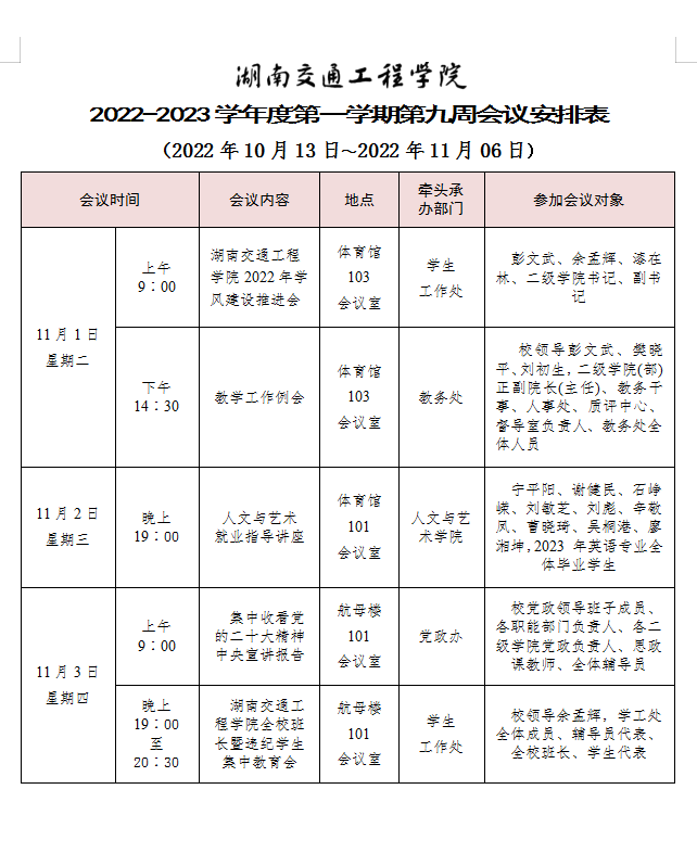 beat365手机版官方网站2022-2023学年度第一学期第九周会议安排表