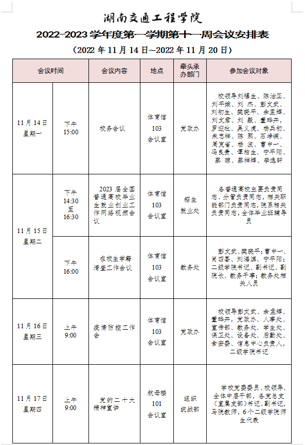 beat365手机版官方网站2022-2023学年度第一学期第十一周会议安排表