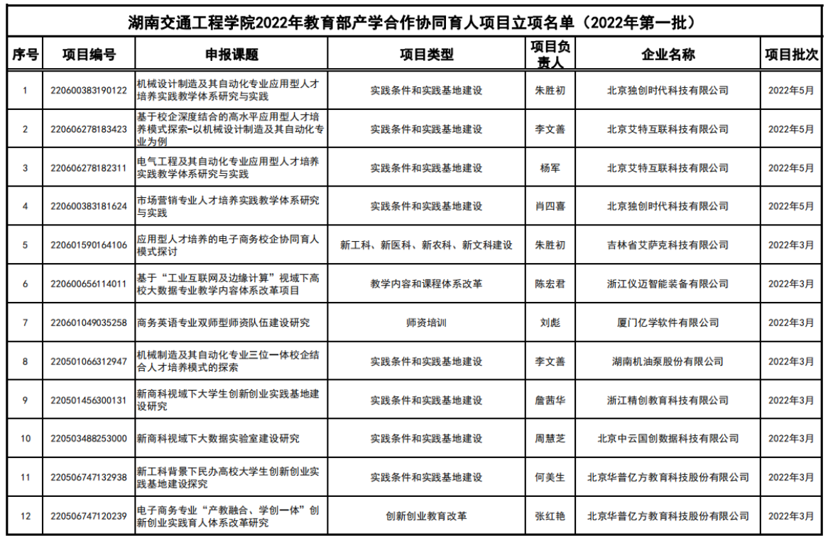 此次立项的12个项目获得了北京、吉林、浙江、厦门等12家知名企业的支持,项目涉及新工科建设、教学内容和课程体系改革、创新创业教育改革、师资培训、实践条件和实践基地建设,共同探索校企协同育人模式。截至日前,beat365已获教育部产学合作协同育人项目累计38项。此外,学校积极组织2022年第二批产学合作协同育人项目申报,已推荐30多项新一批项目的申报。