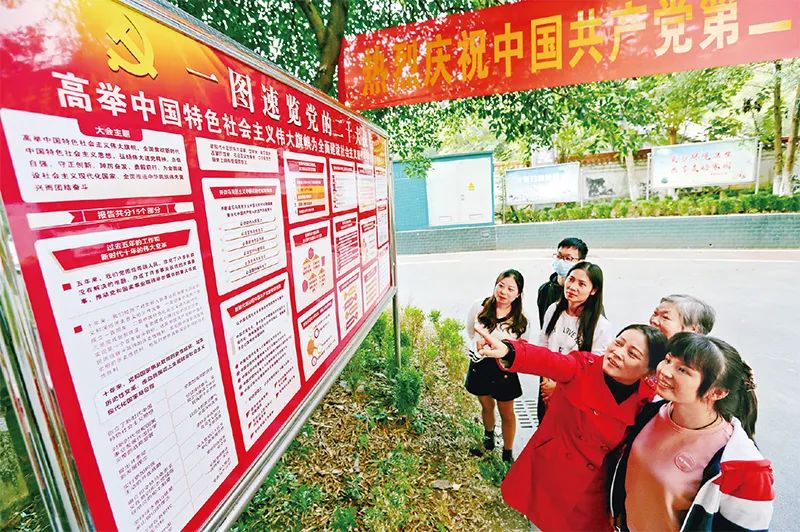 图为2022年10月18日,重庆市万盛经开区东林街道清溪桥社区,刚刚制作好的党的二十大宣传展板吸引了不少居民驻足阅览,热议并学习党的二十大报告。视觉中国 王泸州/摄这10年,见证了历史性的三件大事。我们经历了对党和人民事业具有重大现实意义和深远历史意义的三件大事:一是迎来中国共产党成立一百周年,二是中国特色社会主义进入新时代,三是完成脱贫攻坚、全面建成小康社会的历史任务,实现第一个百年奋斗目标。这是中国共产党和中国人民团结奋斗赢得的历史性胜利,是彪炳中华民族发展史册的历史性胜利,也是对世界具有深远影响的历史性胜利。
