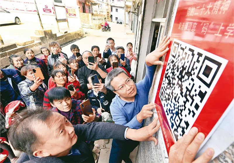 图为2022年11月13日,江西省鄱阳县双港镇党员干部将宣讲党的二十大精神的二维码贴在村头,吸引不少村民前来扫码学习了解有关知识。中新社发 卓忠伟/摄真理之光照亮未来。党的二十大报告在各地各界干部群众中引起强烈反响,大家纷纷表示,10年成就鼓舞人心、宏伟蓝图催人奋进,报告是全面建设社会主义现代化国家、全面推进中华民族伟大复兴的政治宣言和行动纲领。新征程上将踔厉奋发、笃行不怠,争取更加伟大的胜利和荣光。报告在国际社会引发热烈反响,国际人士高度评价中国共产党过去5年的工作和新时代10年的伟大变革,认为中共二十大报告凝聚智慧、反映民意,总结经验、擘画蓝图,传递着中国智慧、中国方案和中国担当,对中国和世界都具有重大意义。
