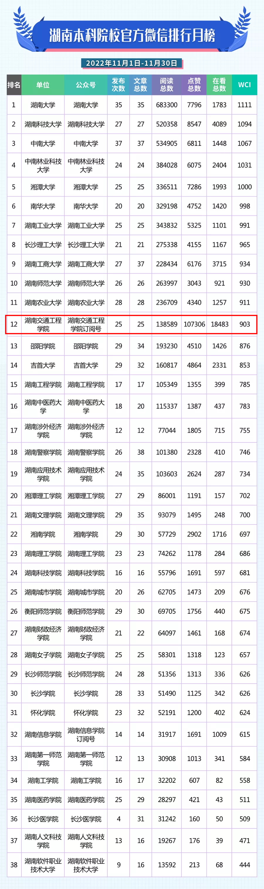本网讯(通讯员  赵红深 刚刚获悉,11月湖南教育政务微信排行榜出炉,beat365官方微信订阅号11月份传播力和影响力持续提升。其中,发布次数25,推文总数25;文章阅读总数138589(10月79526),相比10月增加74.27%;点赞总数107306(10月55098),相比10月增加94.75%,排全省38所本科高校第1;在看总数18483(10月17254),相比10月增加7.12%,排全省38所本科高校第1;带动帐号WCI值首次提升至903(10月792),排全省38所本科高校第12,全省7所民办本科高校第1