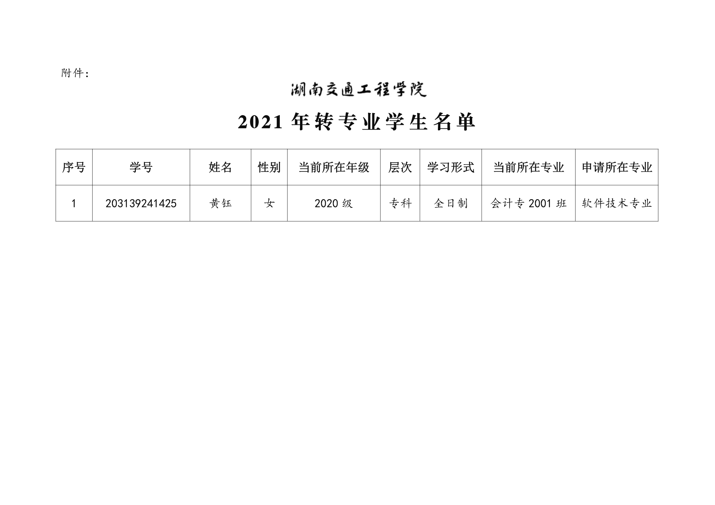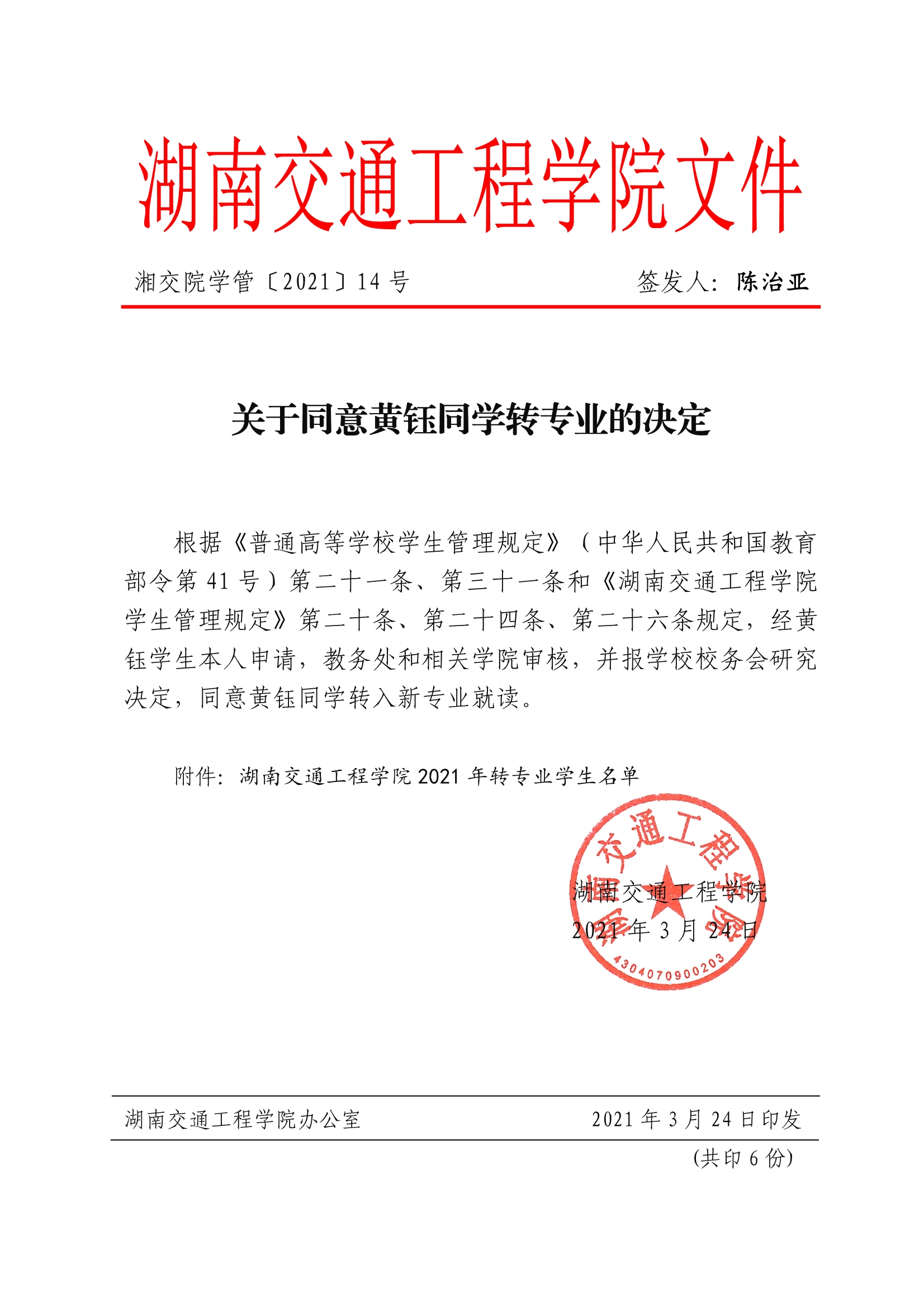 关于同意黄钰同学转专业学习的决定(湘交院学管〔2021〕14号)