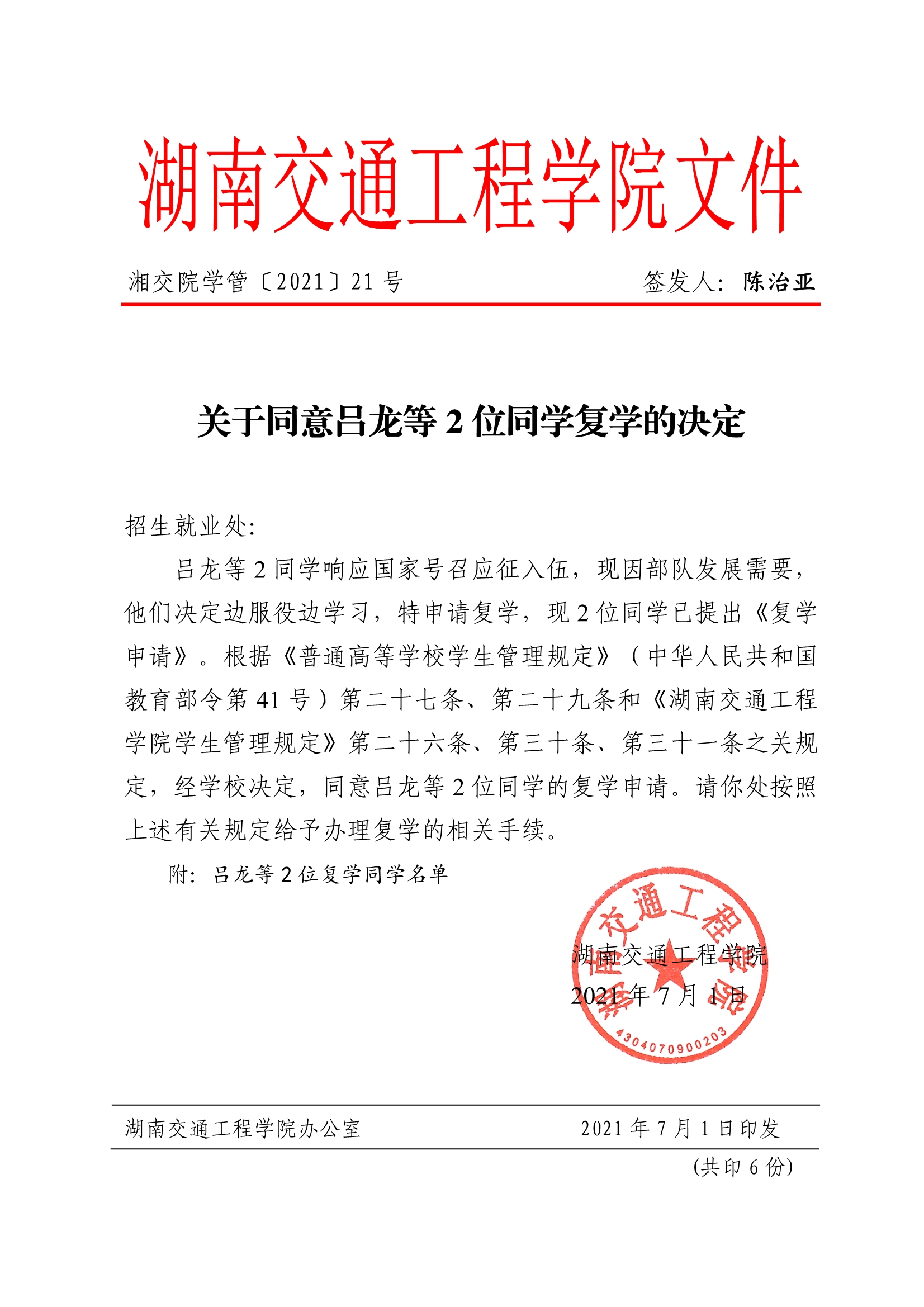 关于同意吕龙等2位同学复学的决定(湘交院学管〔2021〕21号)