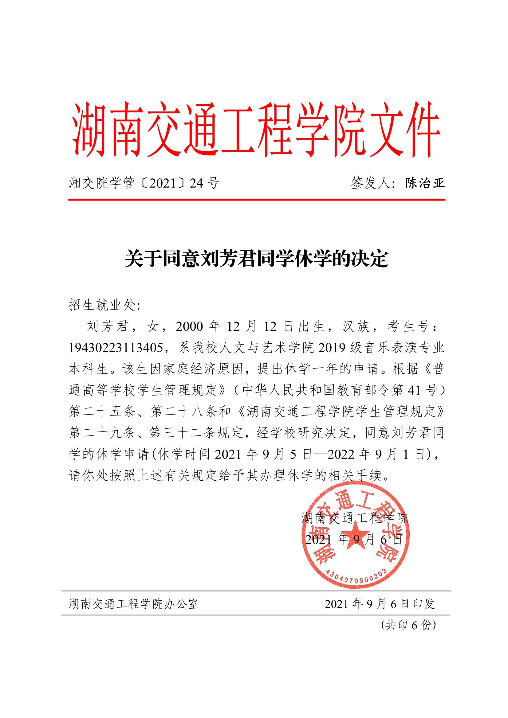 关于同意刘芳君同学休学的决定(湘交院学管〔2021〕24号)