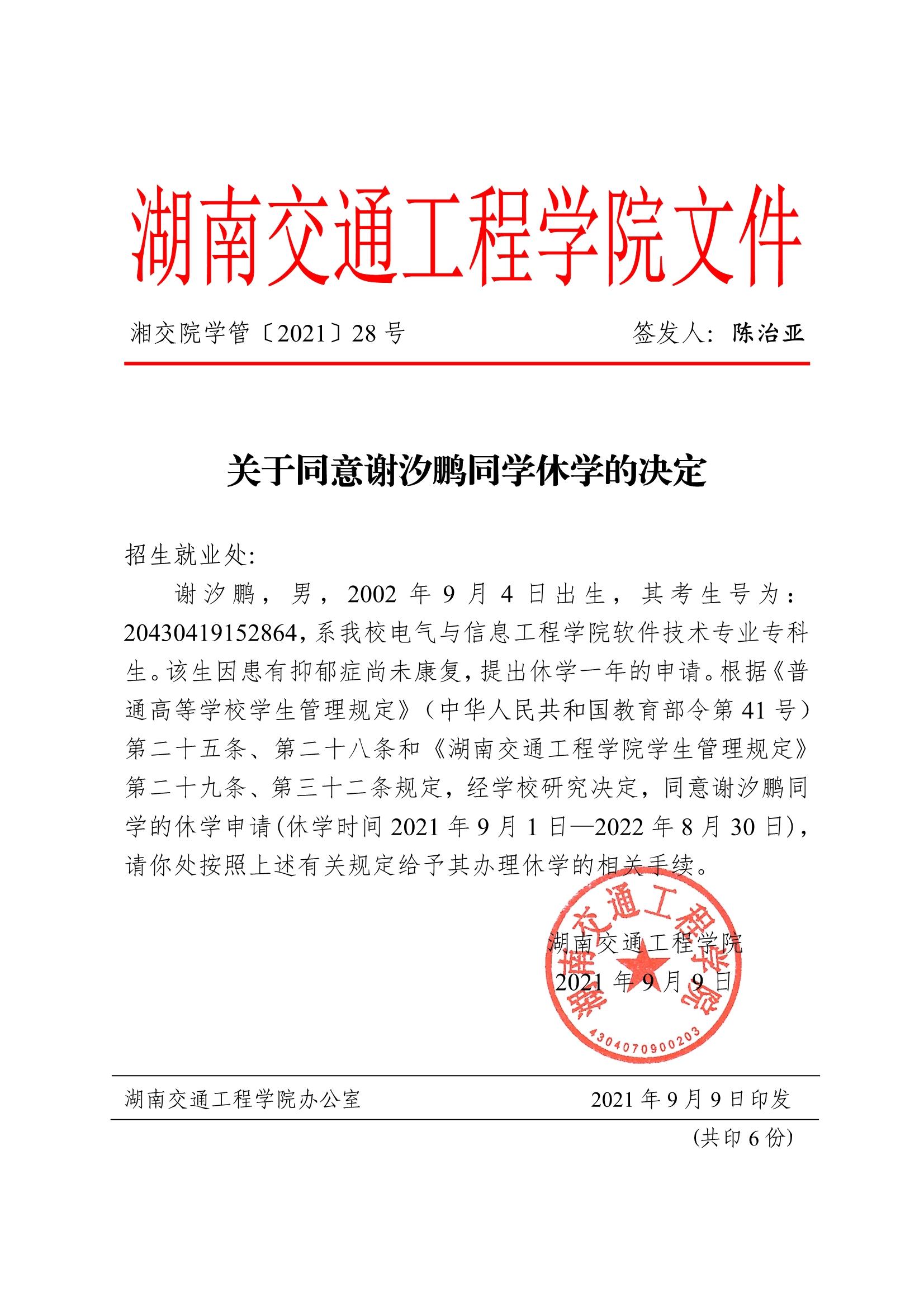 关于同意谢汐鹏同学休学的决定(湘交院学管〔2021〕28号)