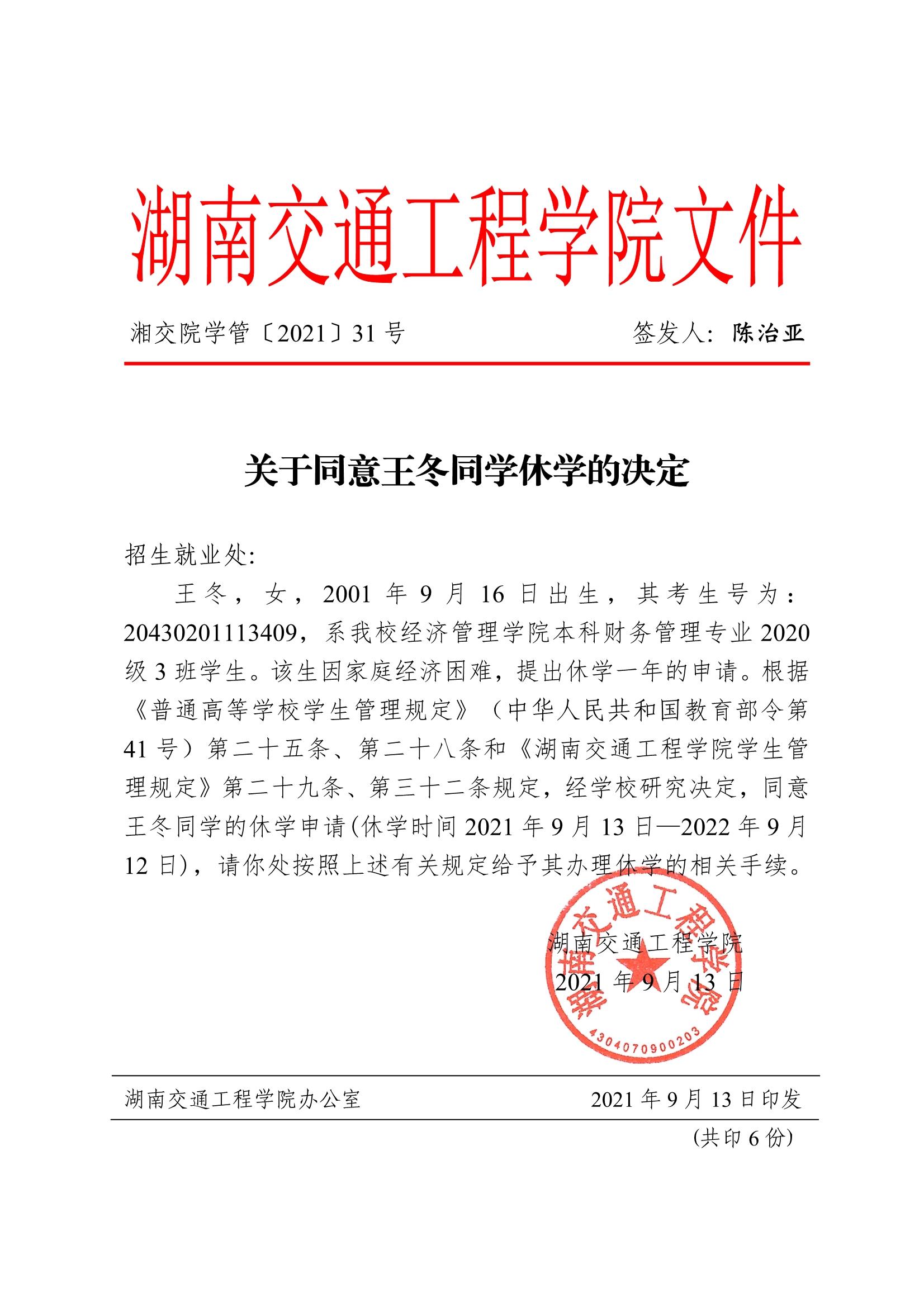 关于同意王冬同学休学的决定(湘交院学管〔2021〕31号)