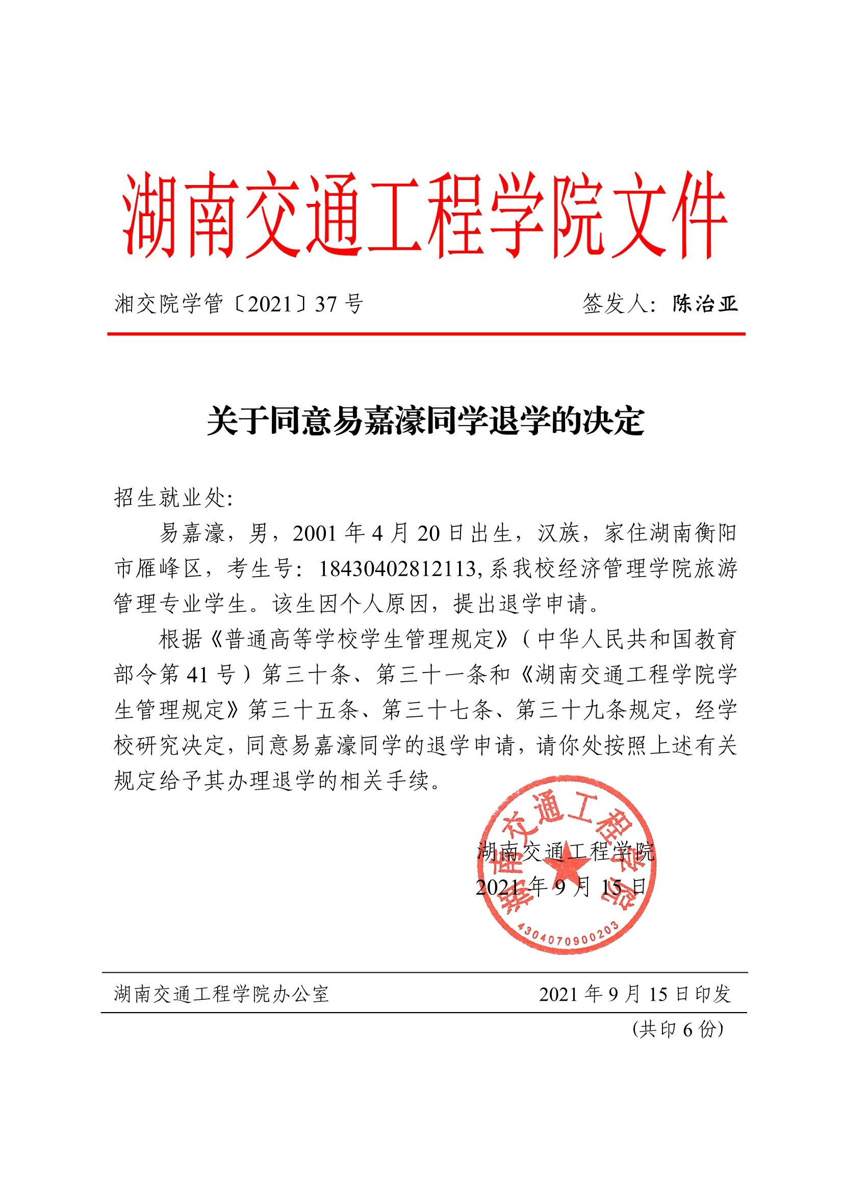 关于同意易嘉濠同学退学的决定(湘交院学管〔2021〕37号)