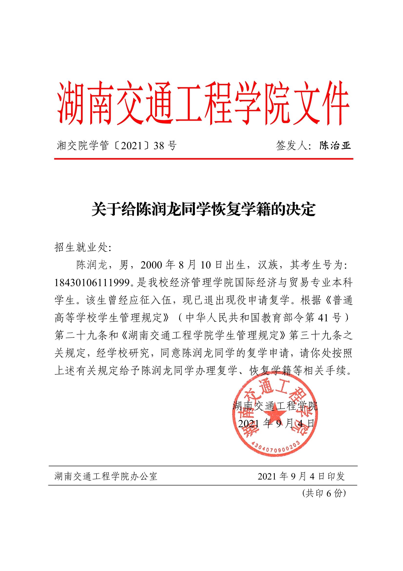 关于给陈润龙同学恢复学籍的决定(湘交院学管〔2021〕38号)