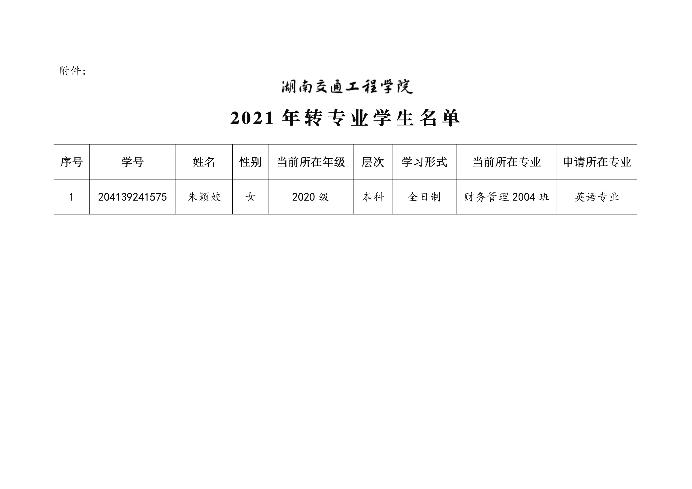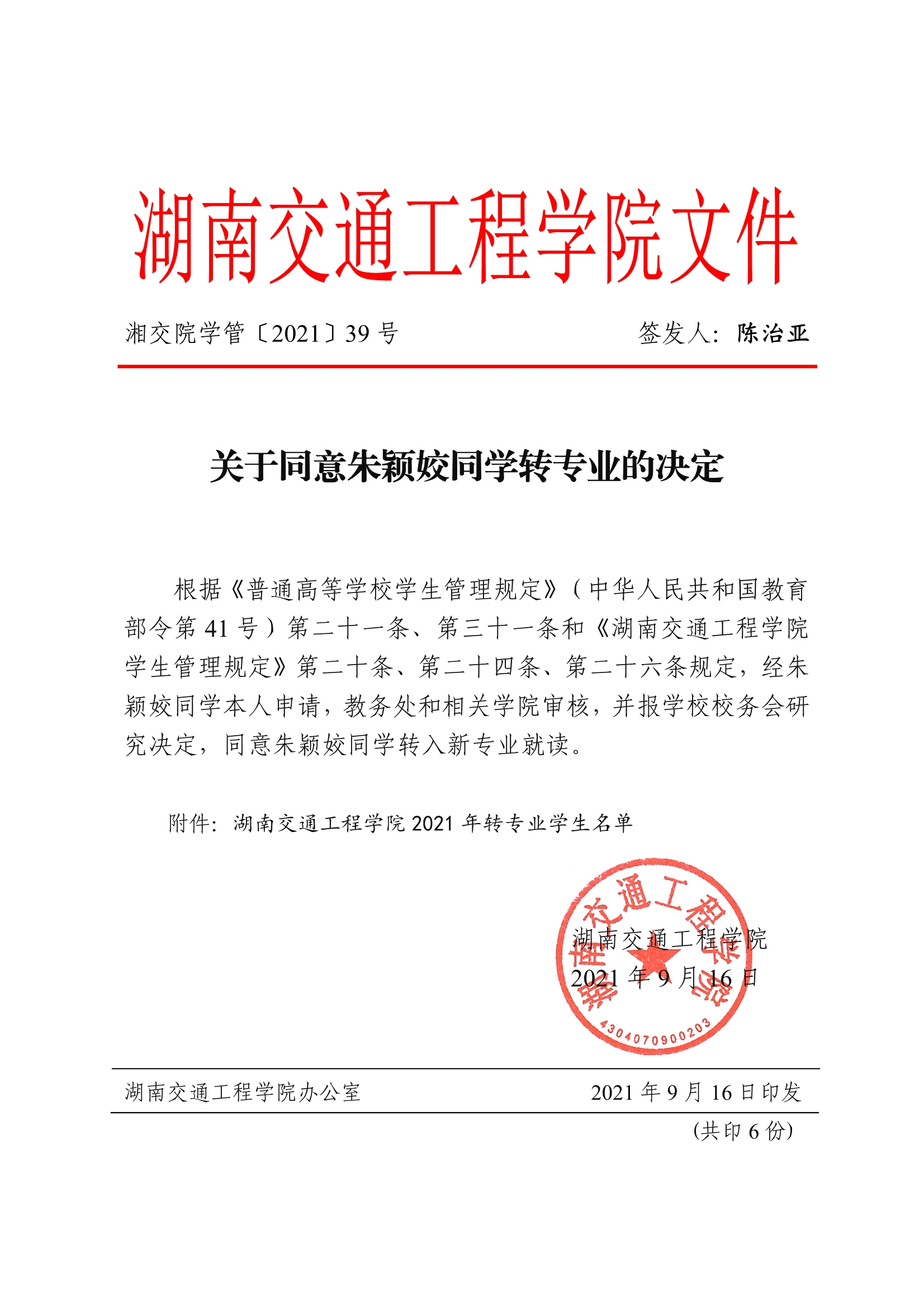 关于同意朱颖姣同学转专业学习的决定(湘交院学管〔2021〕39号)