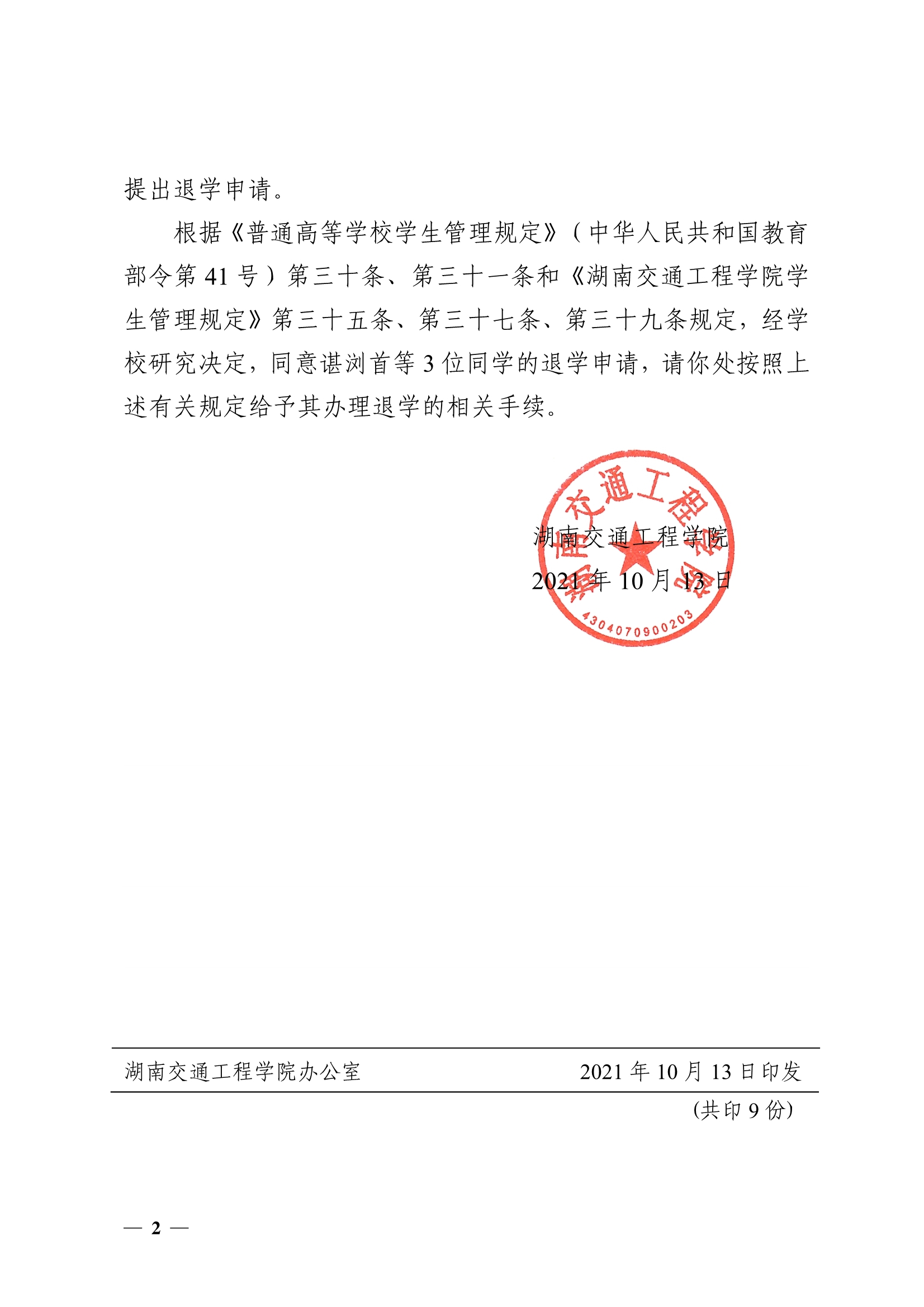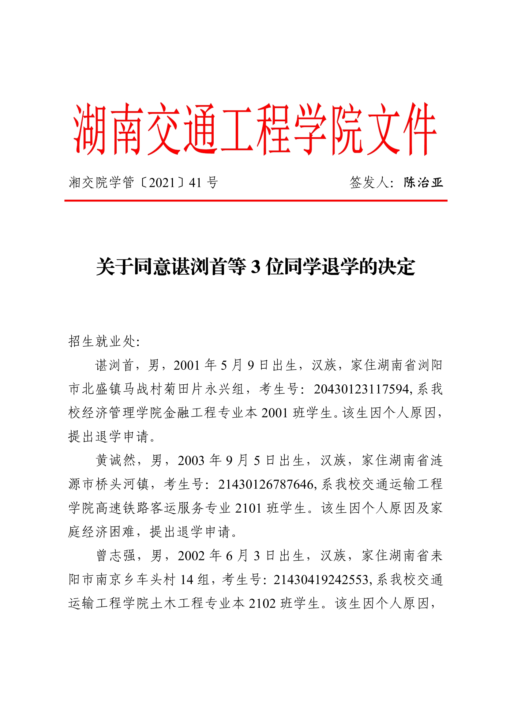 关于同意谌浏首等3位同学退学的决定(湘交院学管〔2021〕41号)