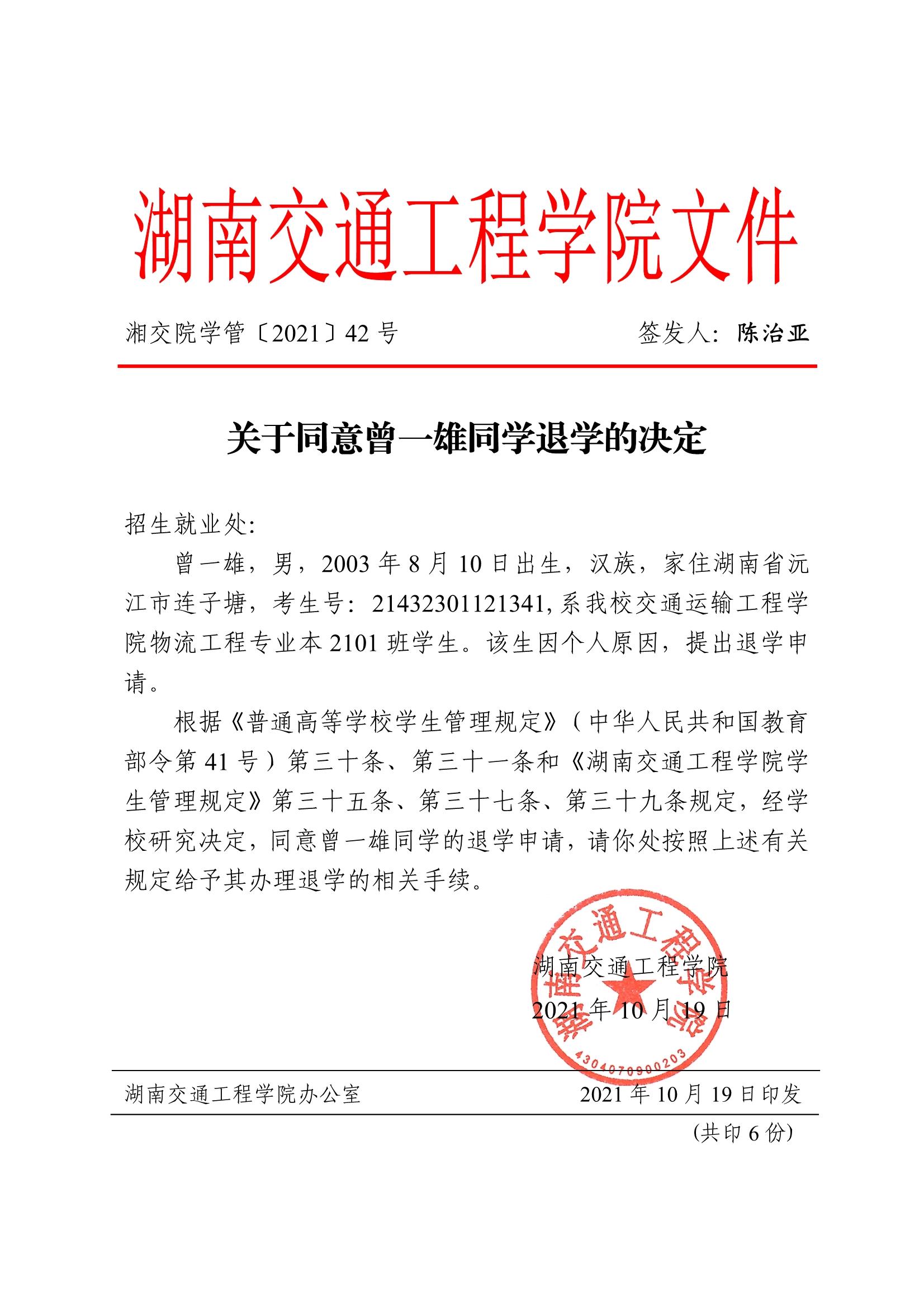 关于同意曾一雄同学退学的决定(湘交院学管〔2021〕42号)