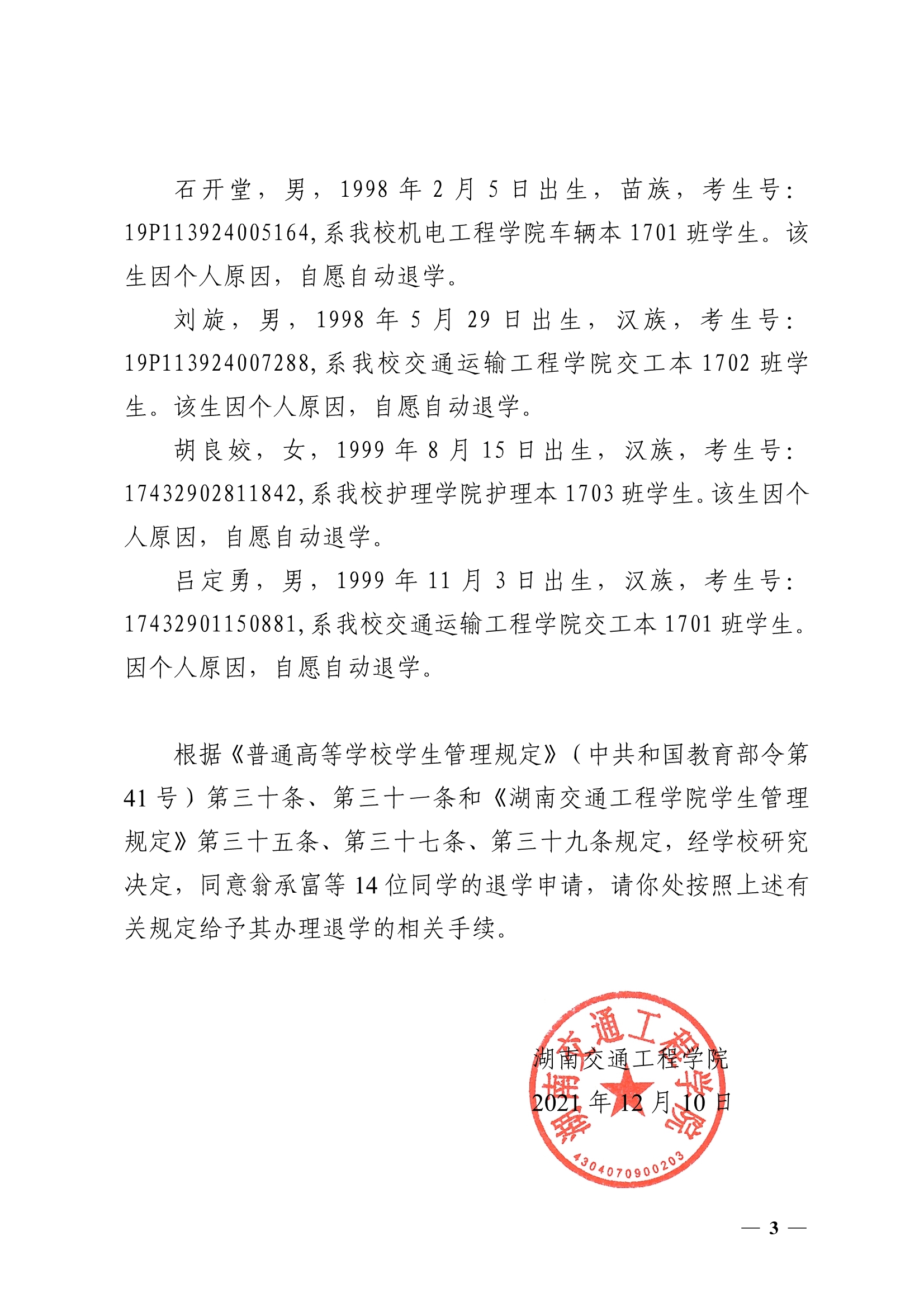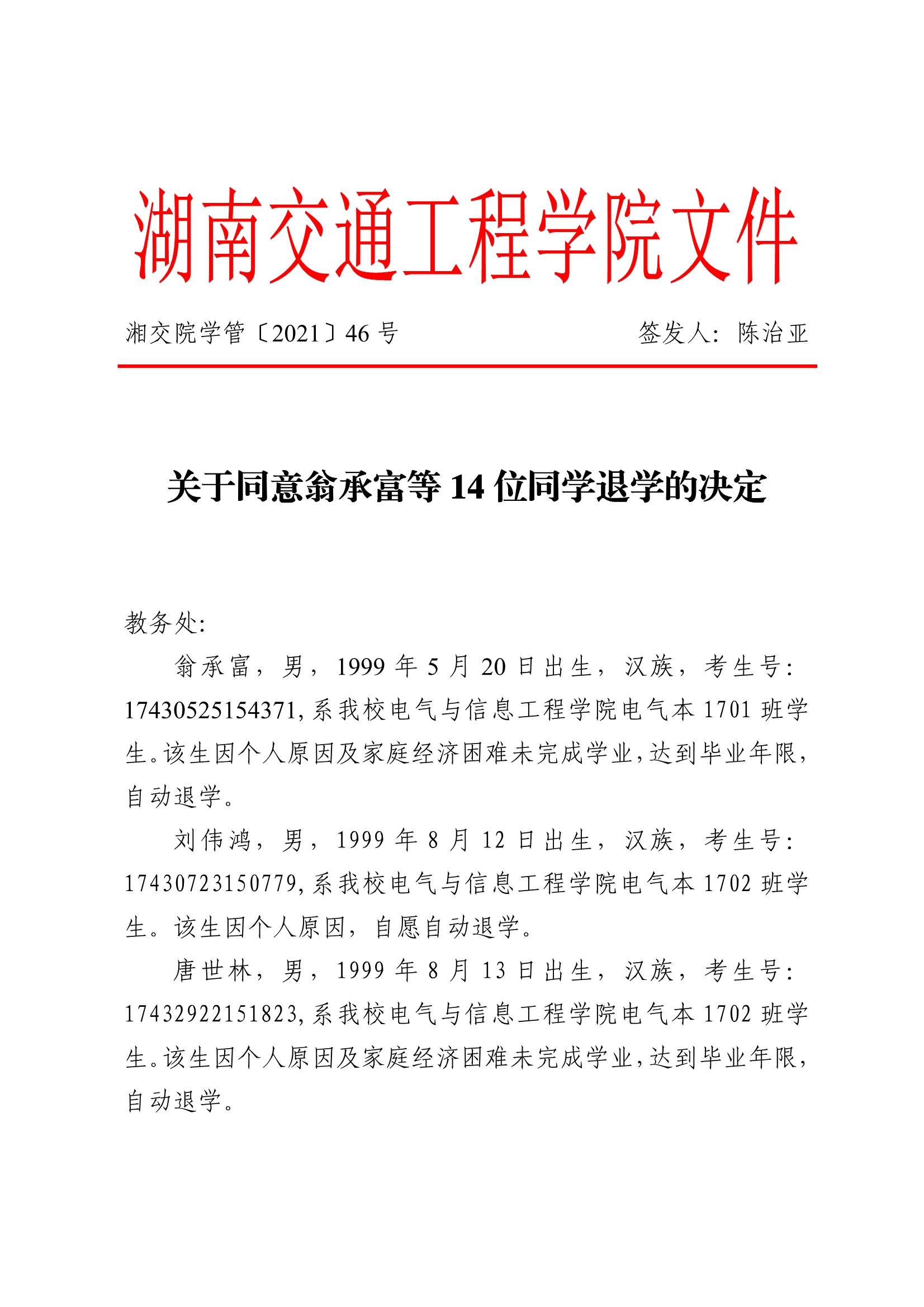 关于同意翁承富等14位同学退学的决定(湘交院学管〔2021〕46号)