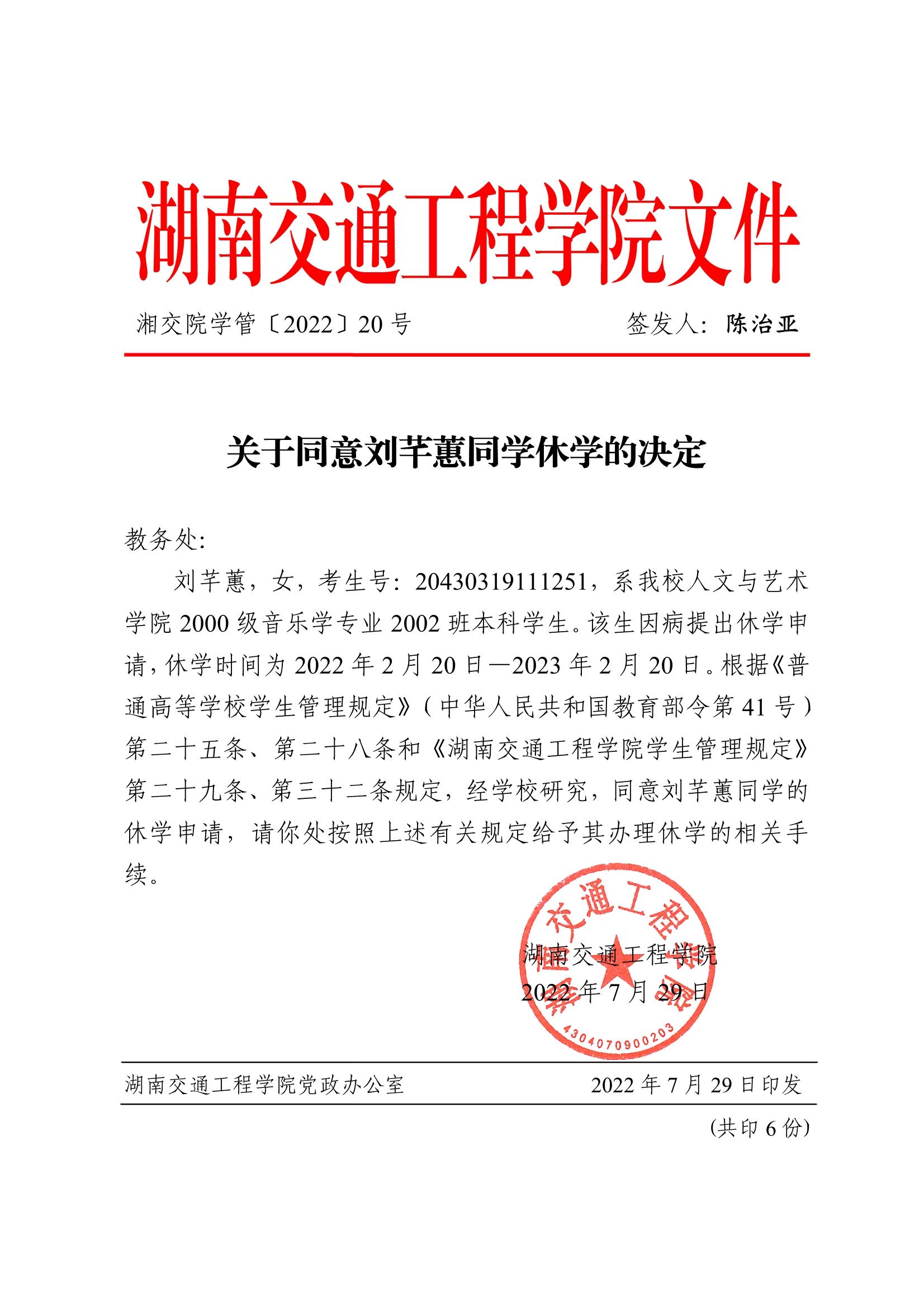 关于同意刘芊蕙同学休学的决定(湘交院学管〔2022〕20号)