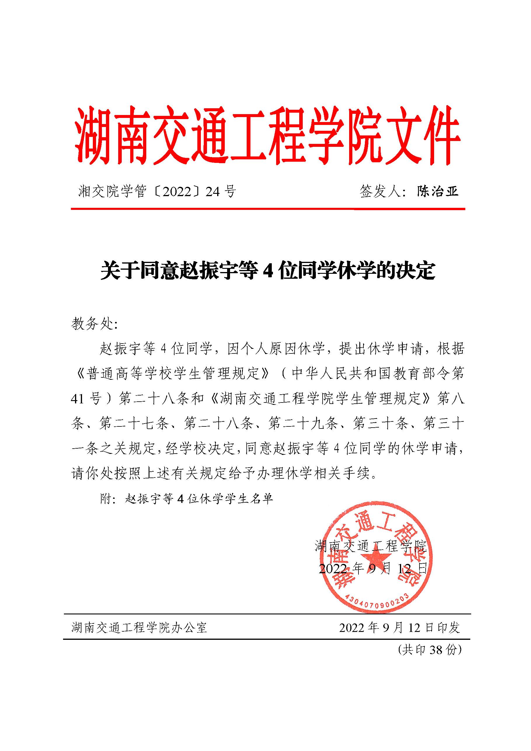 关于同意赵振宇等4位同学休学的决定(湘交院学管〔2022〕24号)