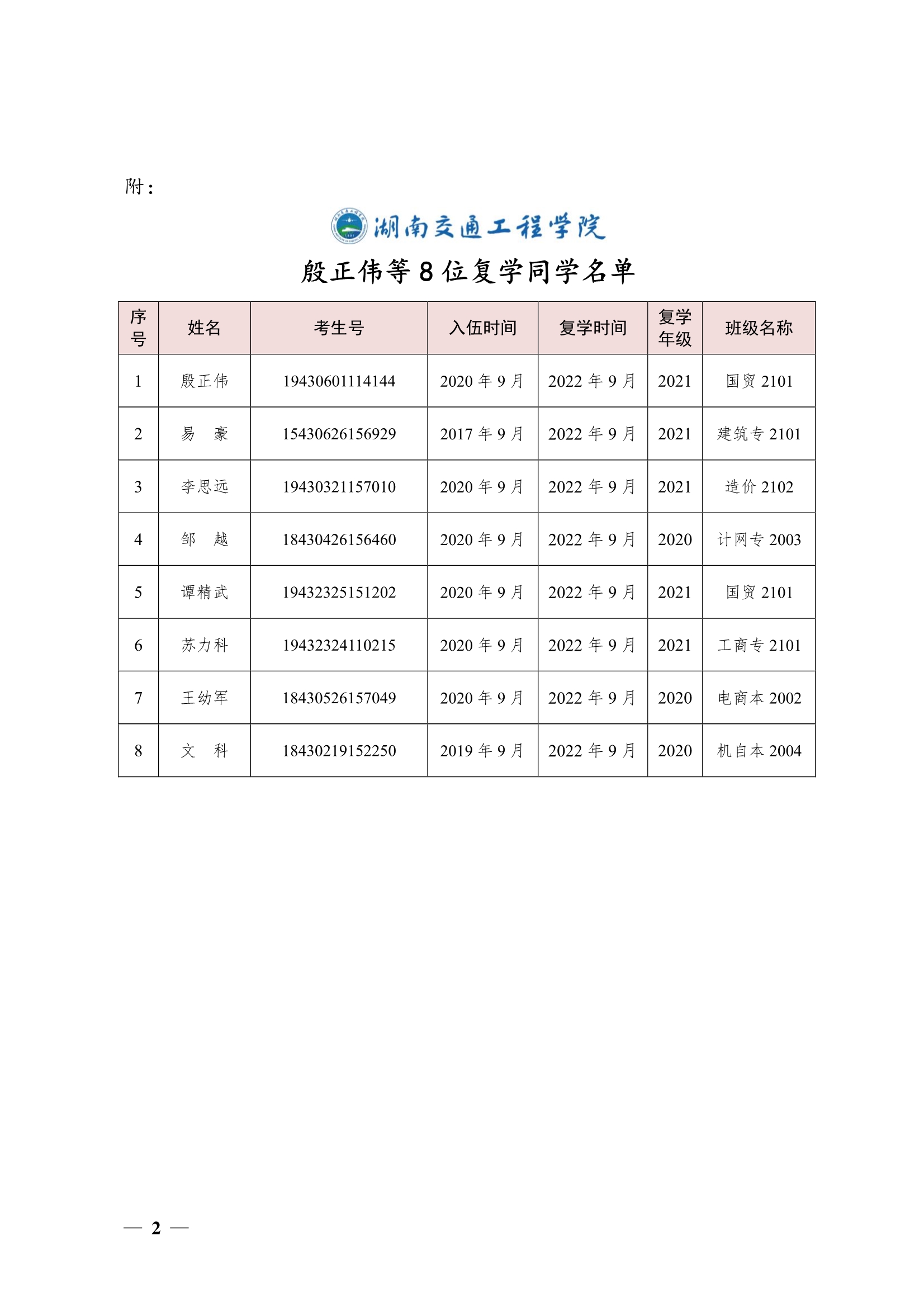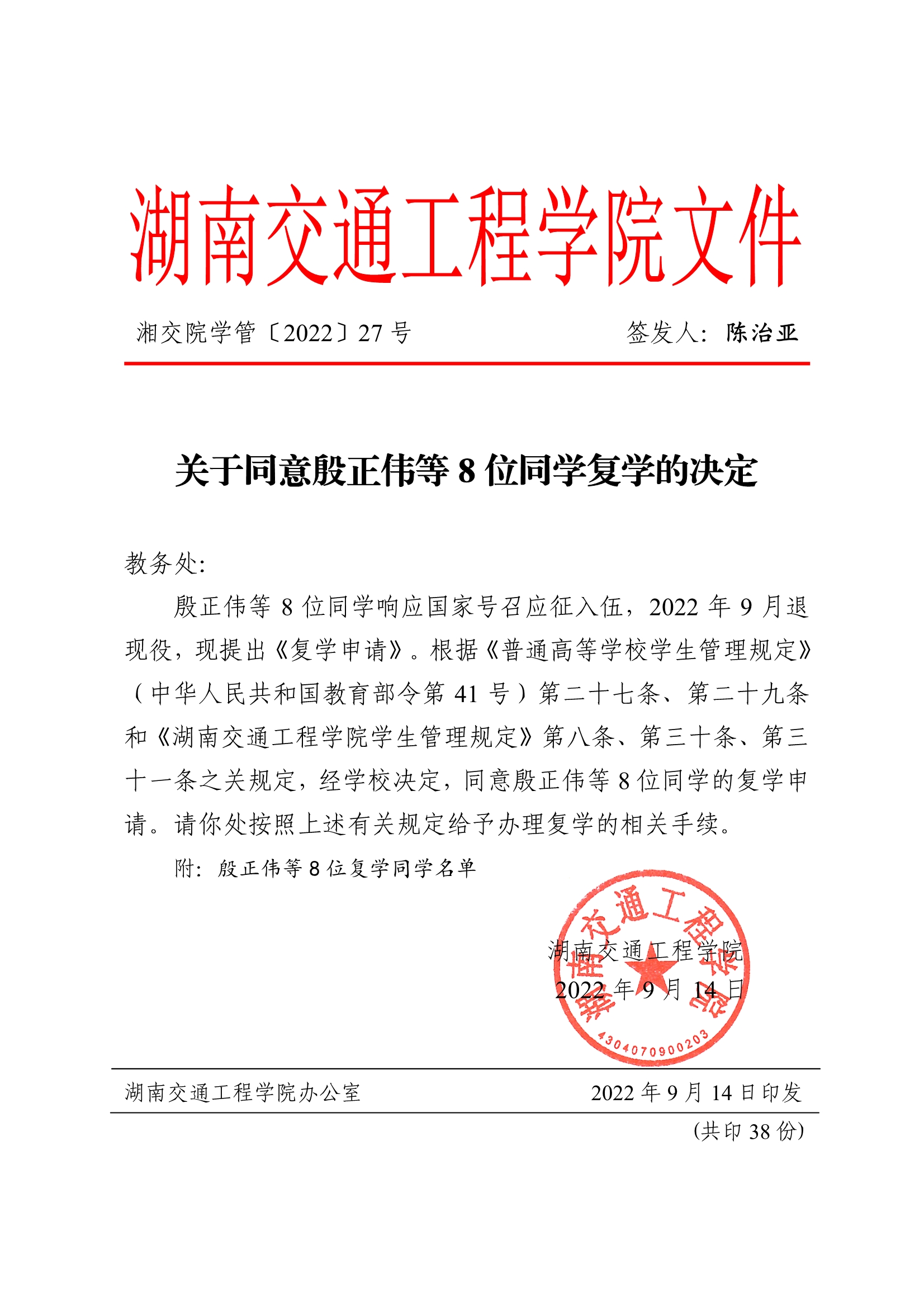 关于同意殷正伟等8位同学复学的决定(湘交院学管〔2022〕27号)