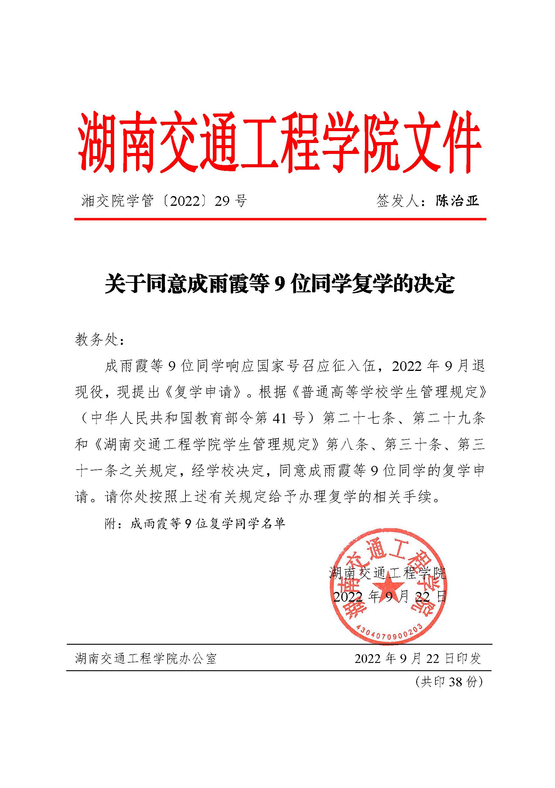 关于同意成雨霞等9位同学复学的决定(湘交院学管〔2022〕29号)