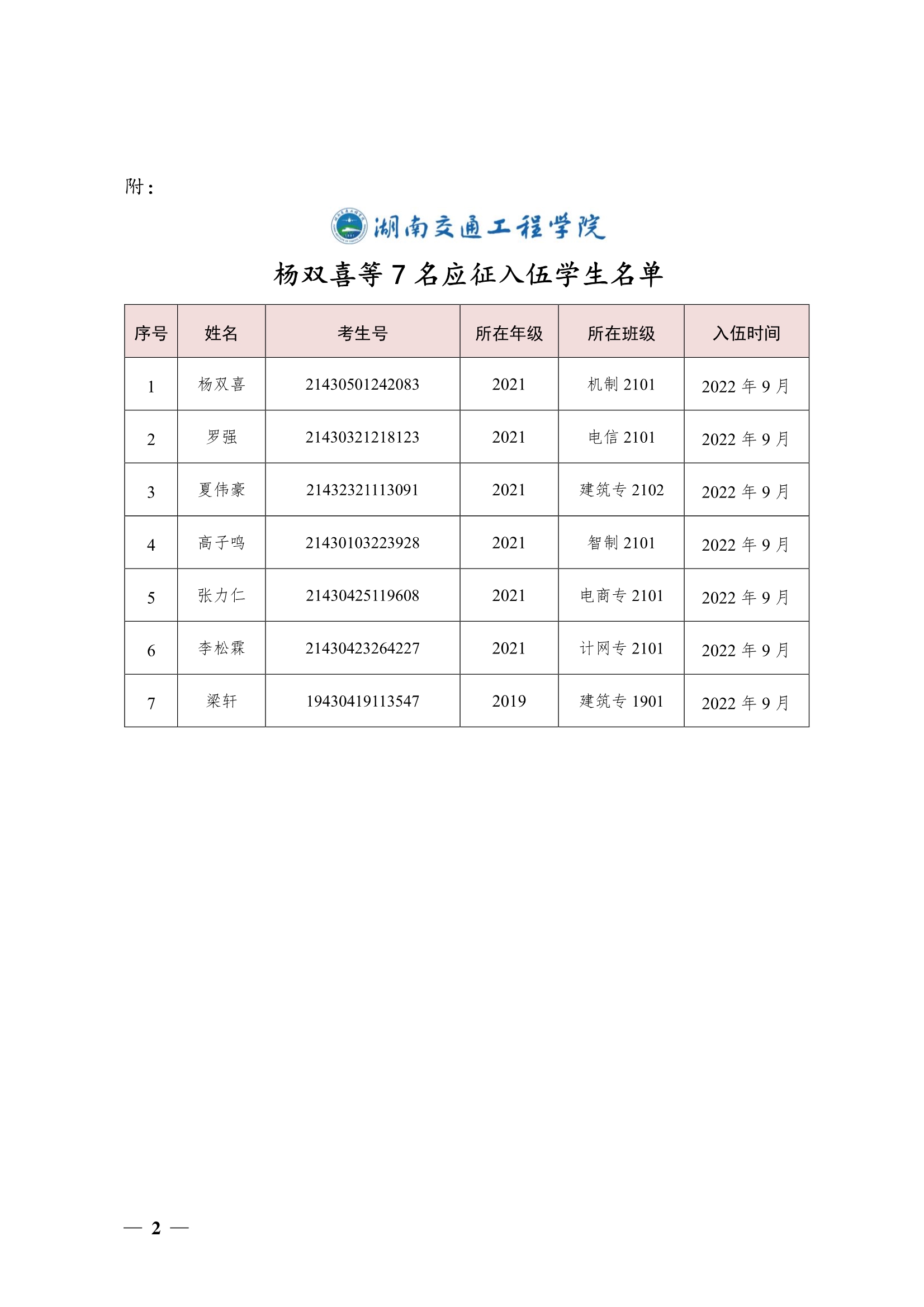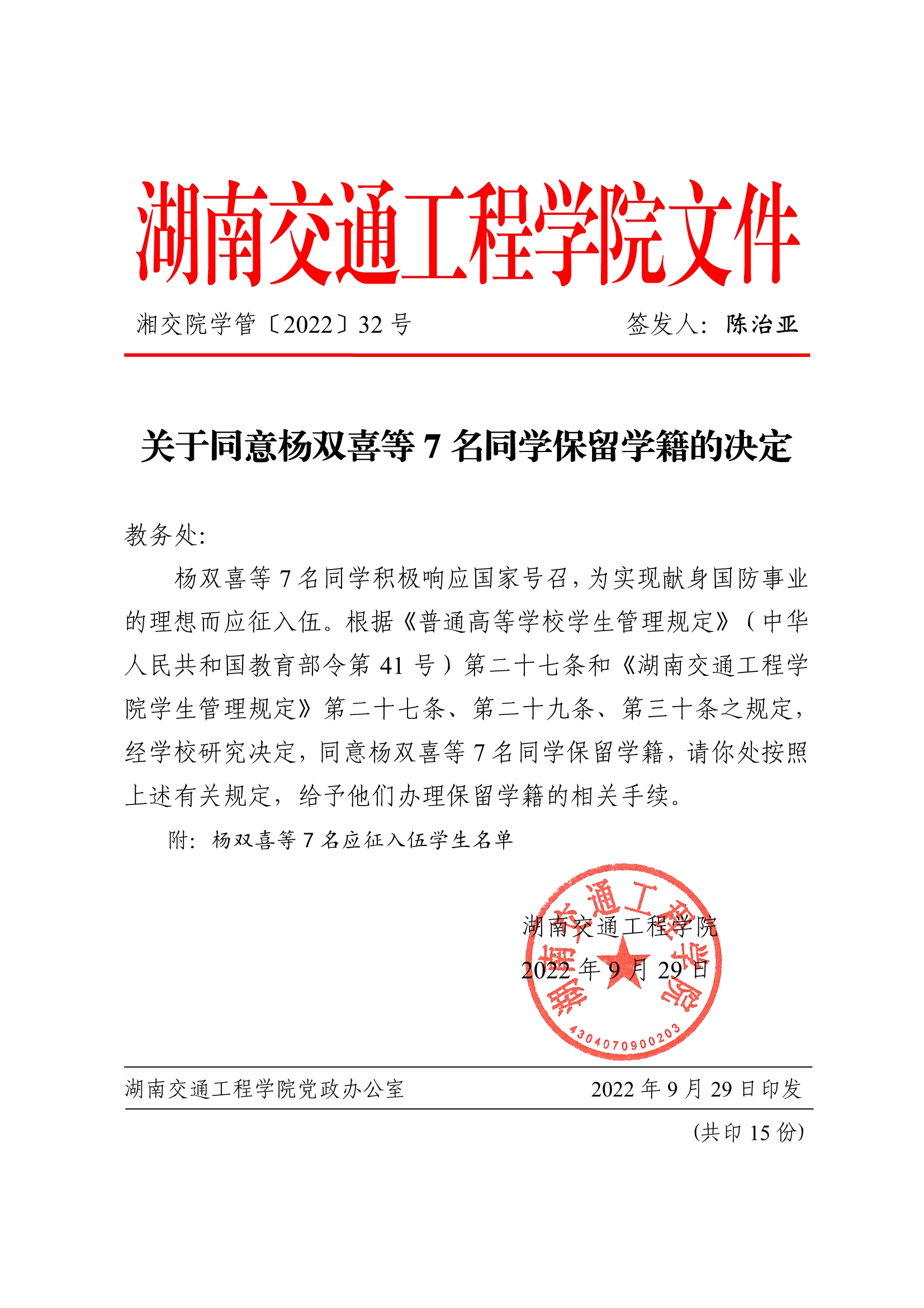 关于同意杨双喜等7名同学保留学籍的决定(湘交院学管〔2022〕32号)