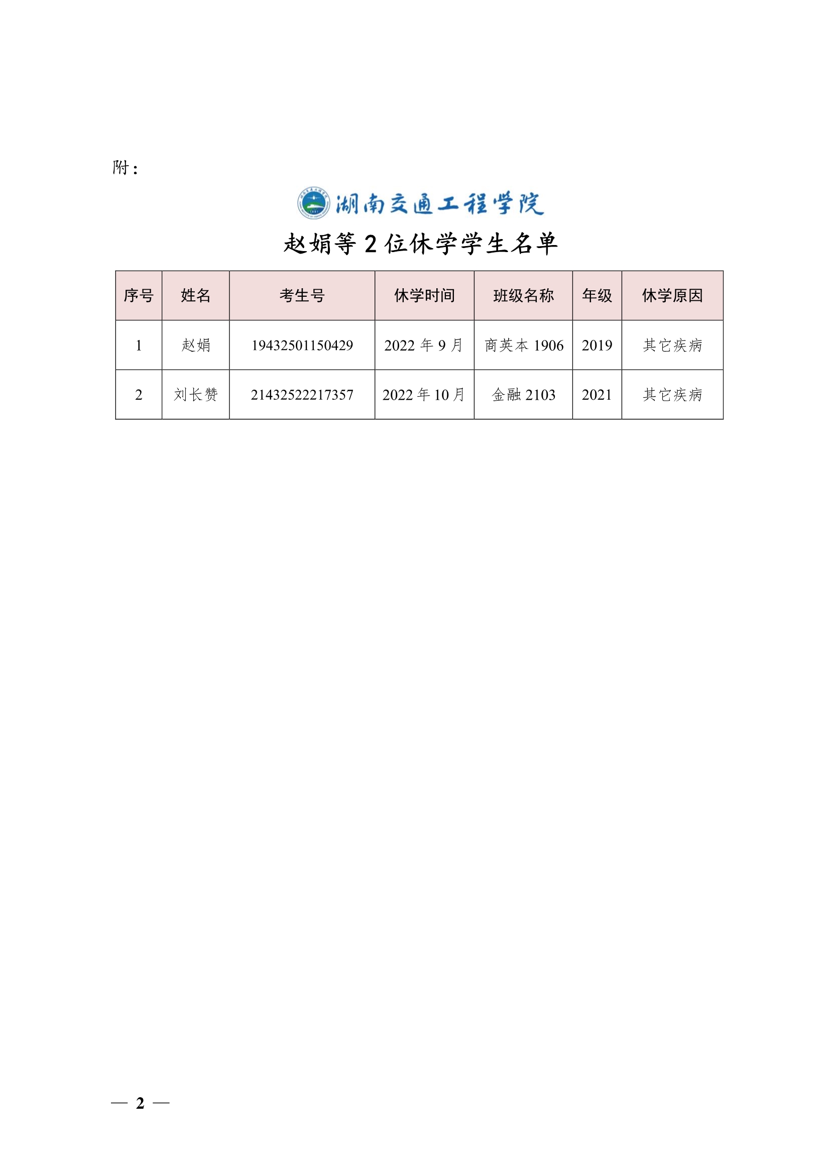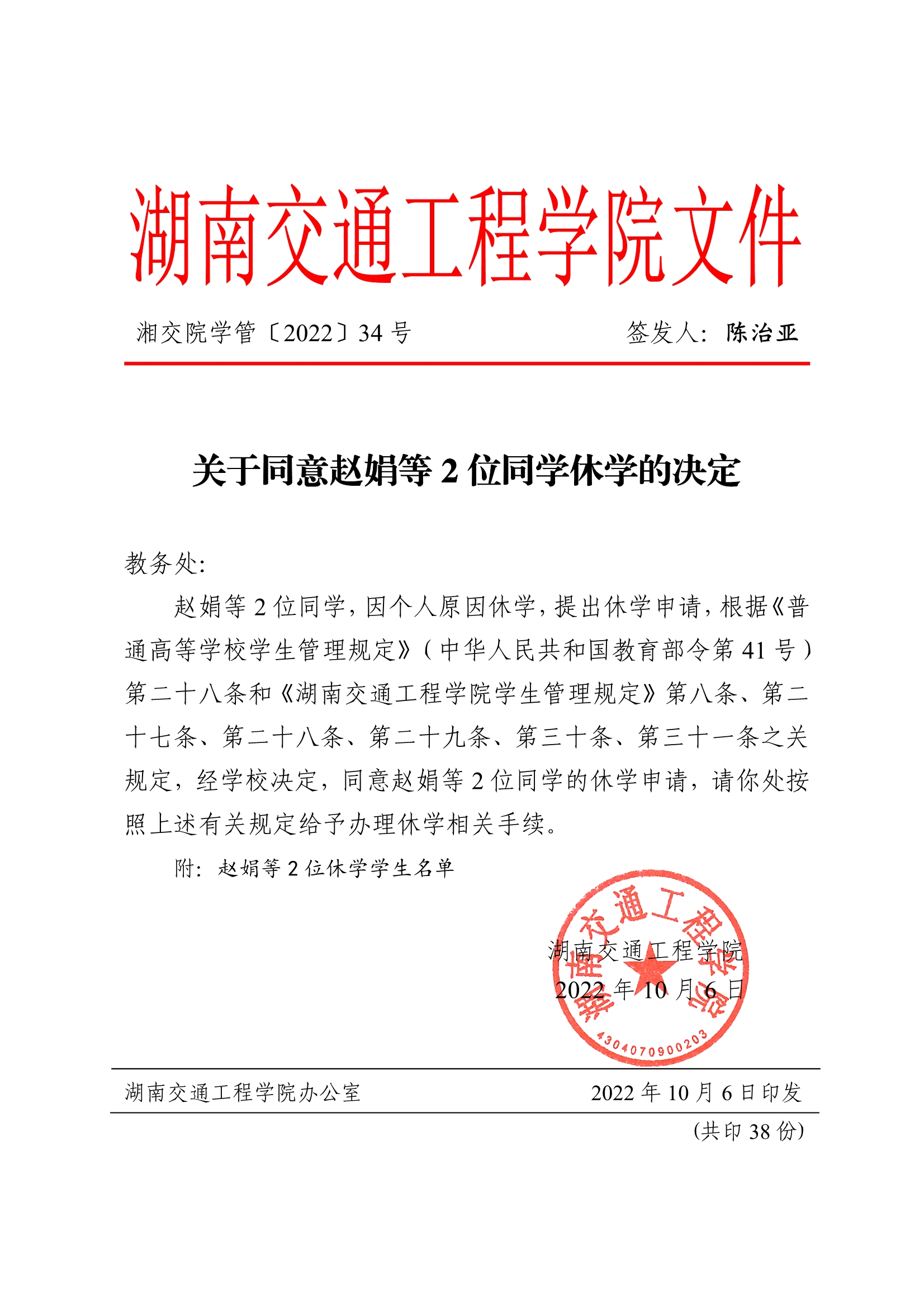 关于同意赵娟等2位同学休学的决定(湘交院学管〔2022〕34号)