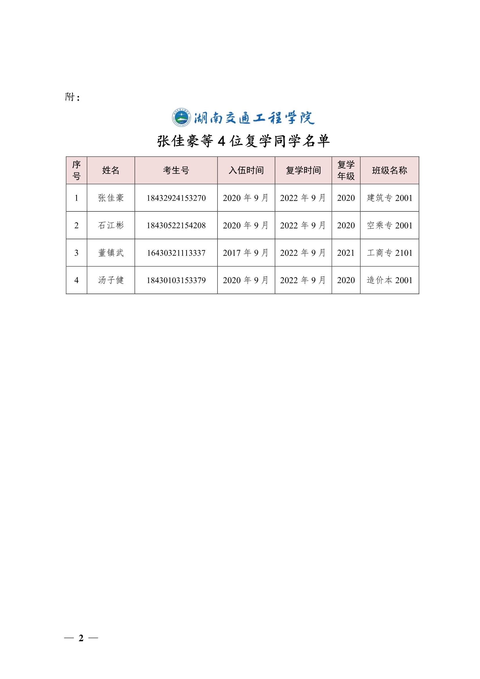 关于同意张佳豪等4位同学复学的决定(湘交院学管〔2022〕35号)