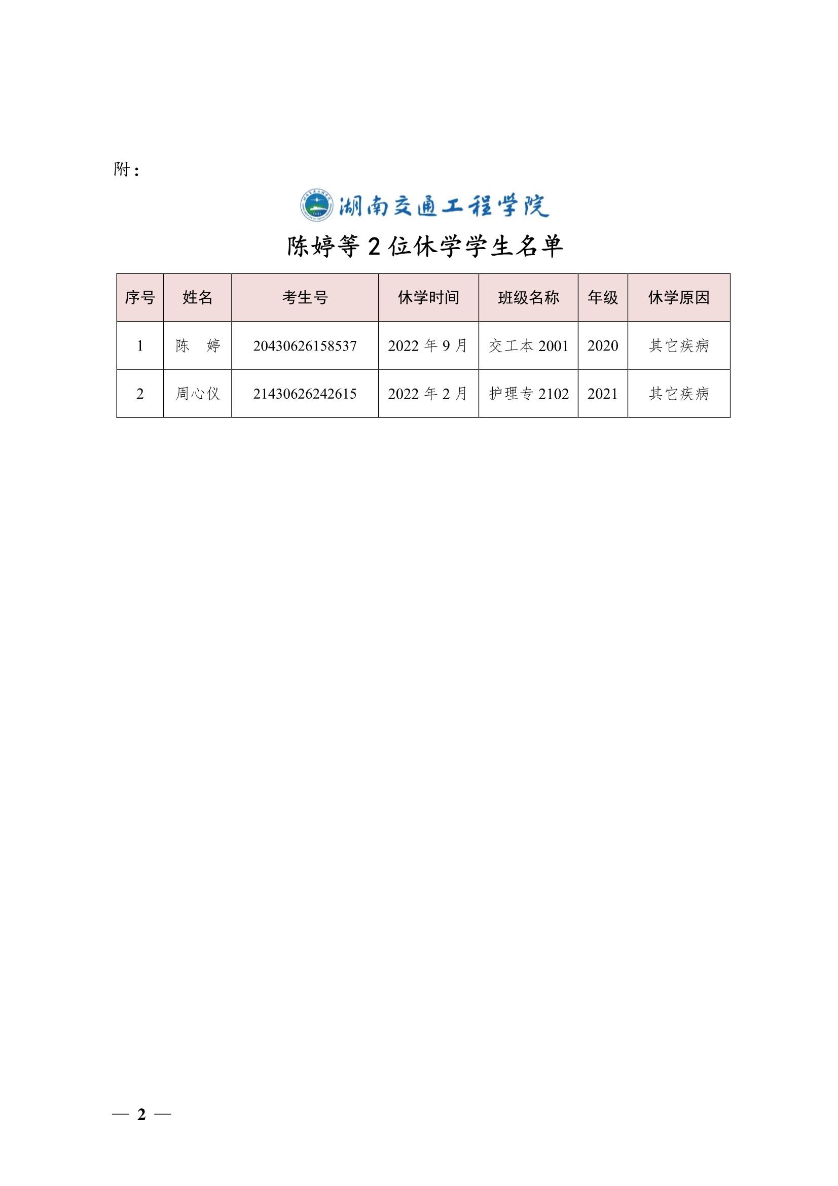 关于同意陈婷等2位同学休学的决定(湘交院学管〔2022〕38号)