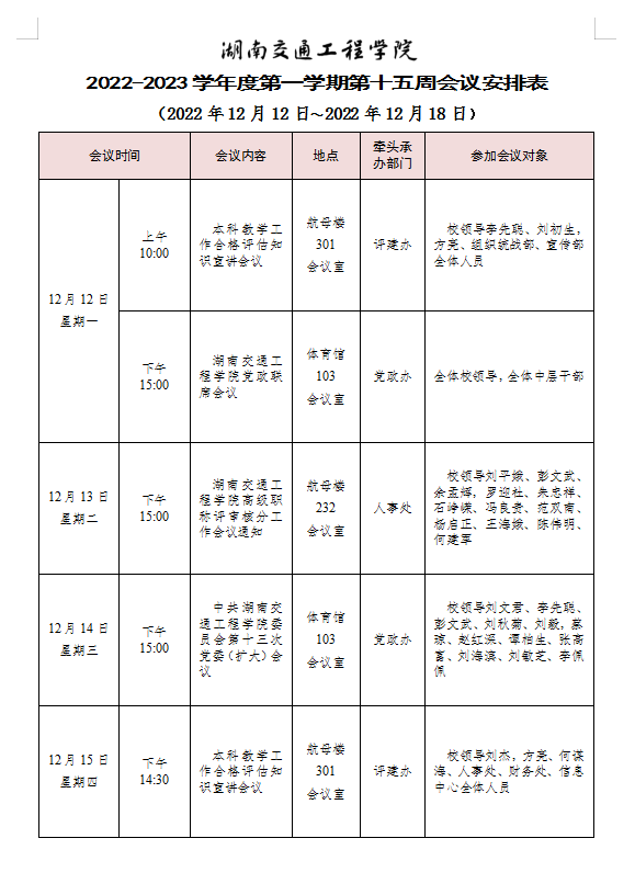 beat365手机版官方网站 2022-2023学年度第一学期第十五周会议安排表