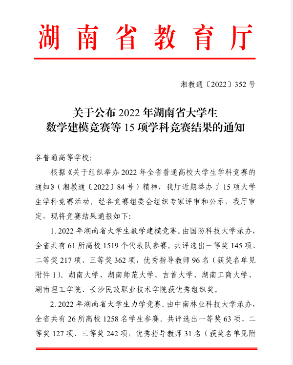 关于公布2022年湖南省大学生数学建模竞赛等15项学科竞赛结果的通知(1)