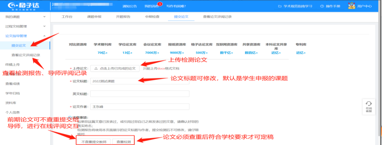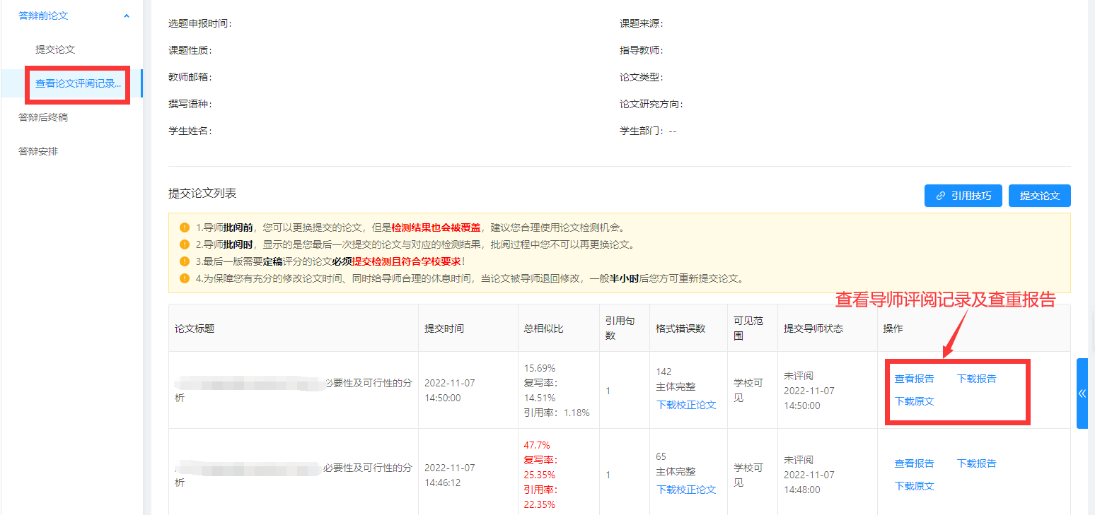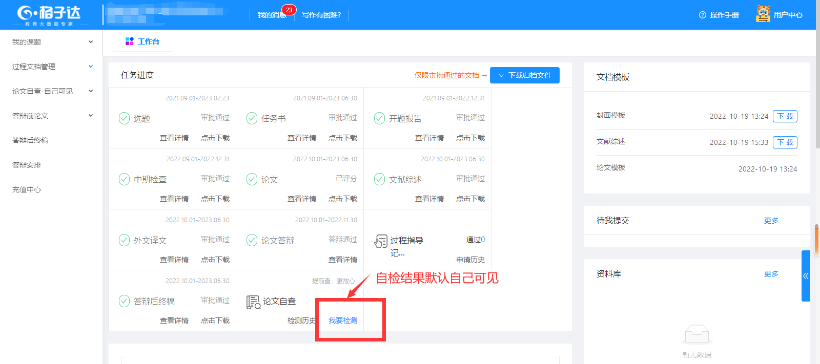 自检结果默认仅自己可见,也可在结果出来后手动提交导师。