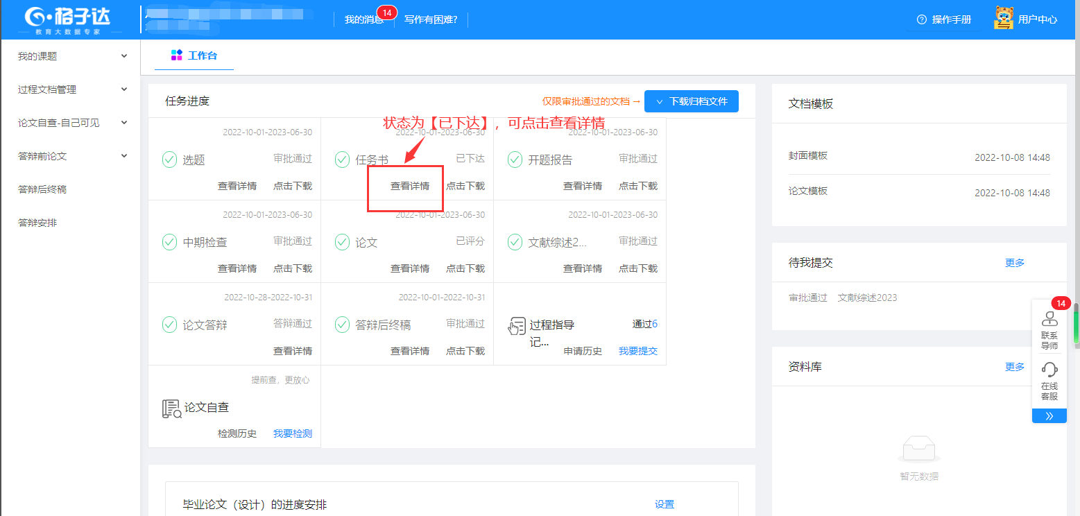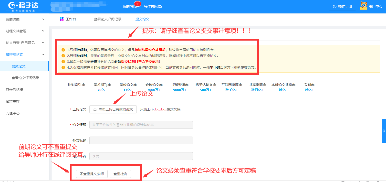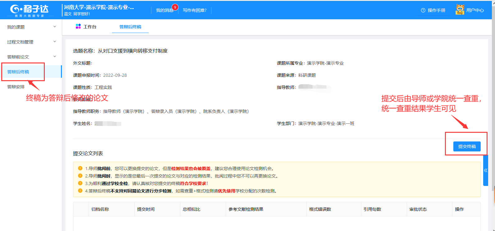 自检结果默认仅自己可见,也可在结果出来后手动提交导师。