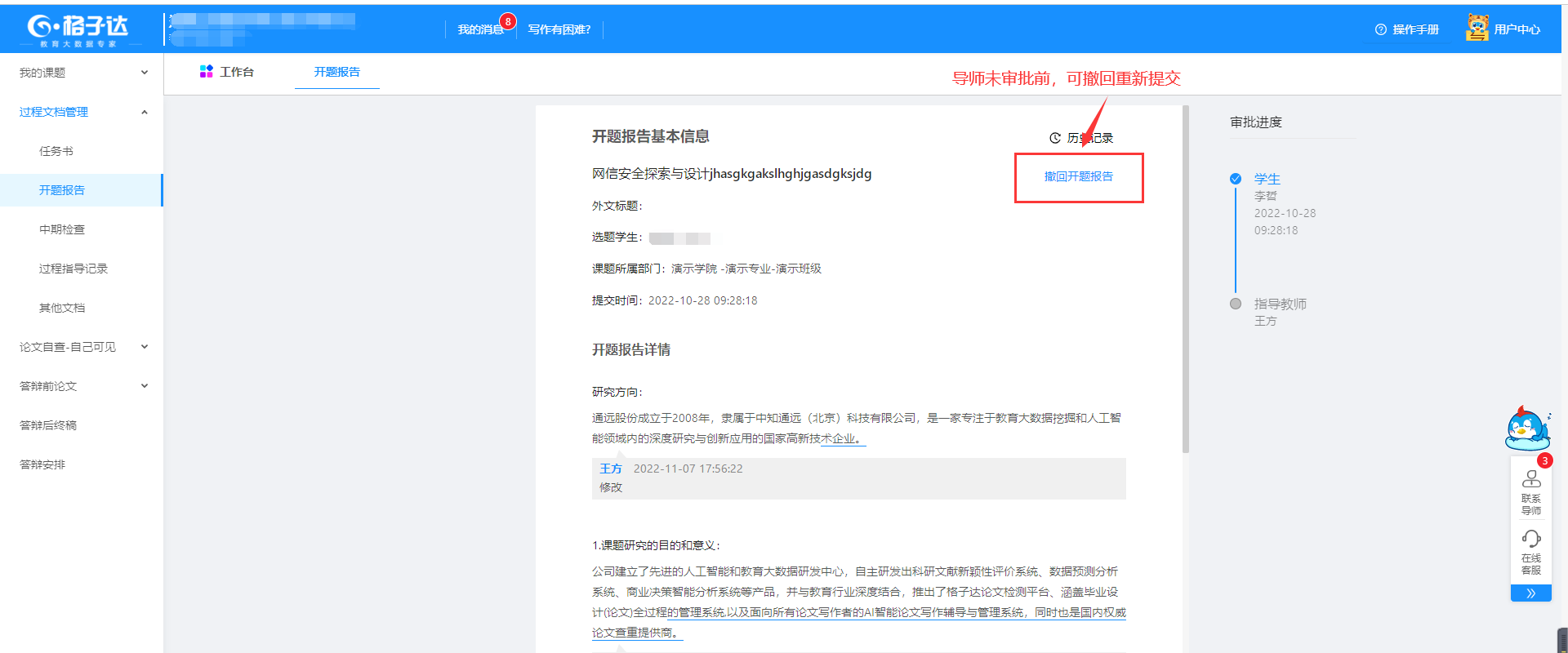 提示:在线表单形式直接输入内容,导师未审批前,可撤回重新提交。