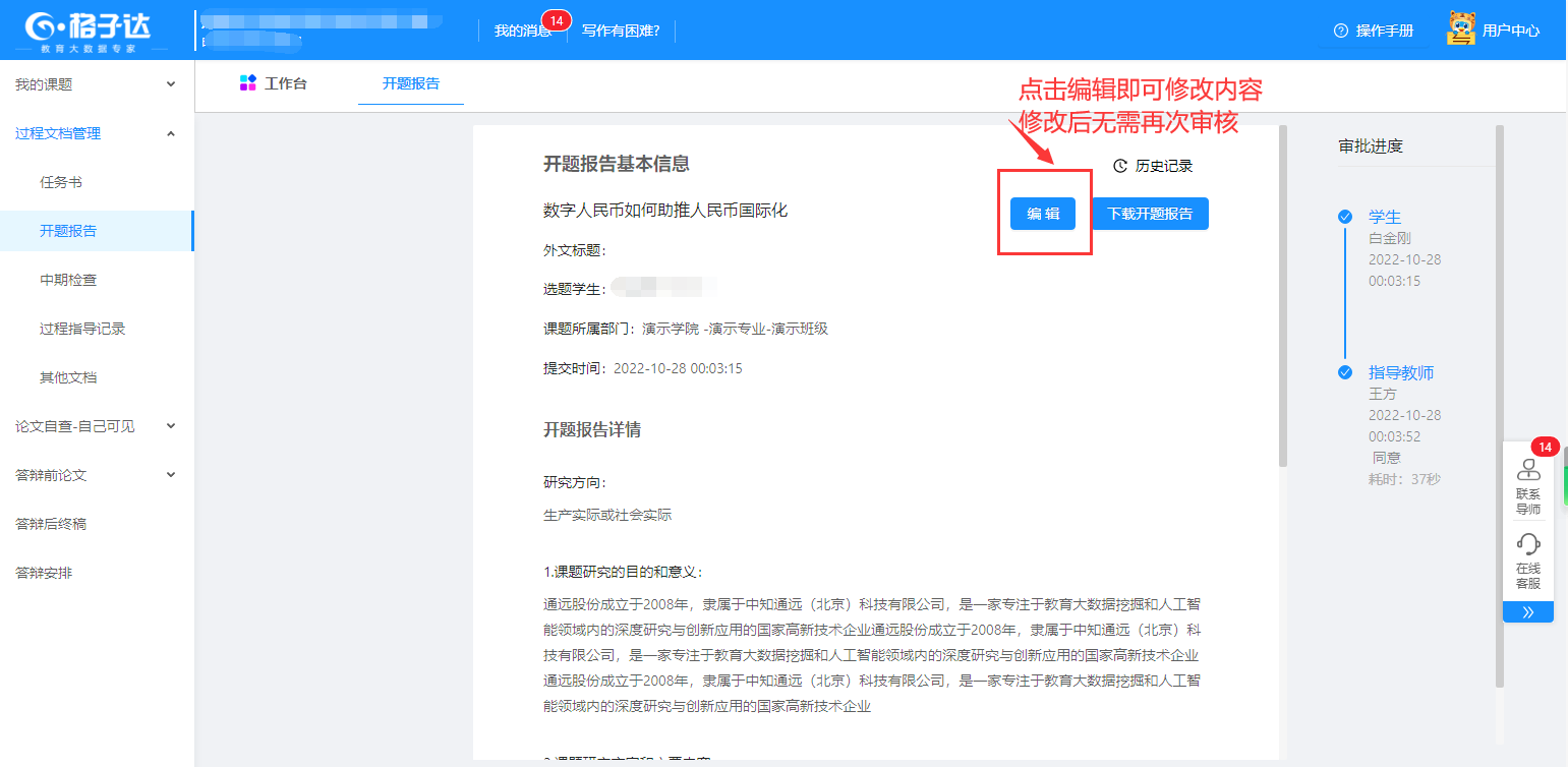 由导师授权修改,授权一次可修改一次。修改课题内容点击提交即可,无需再次审核。
