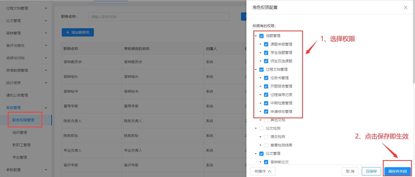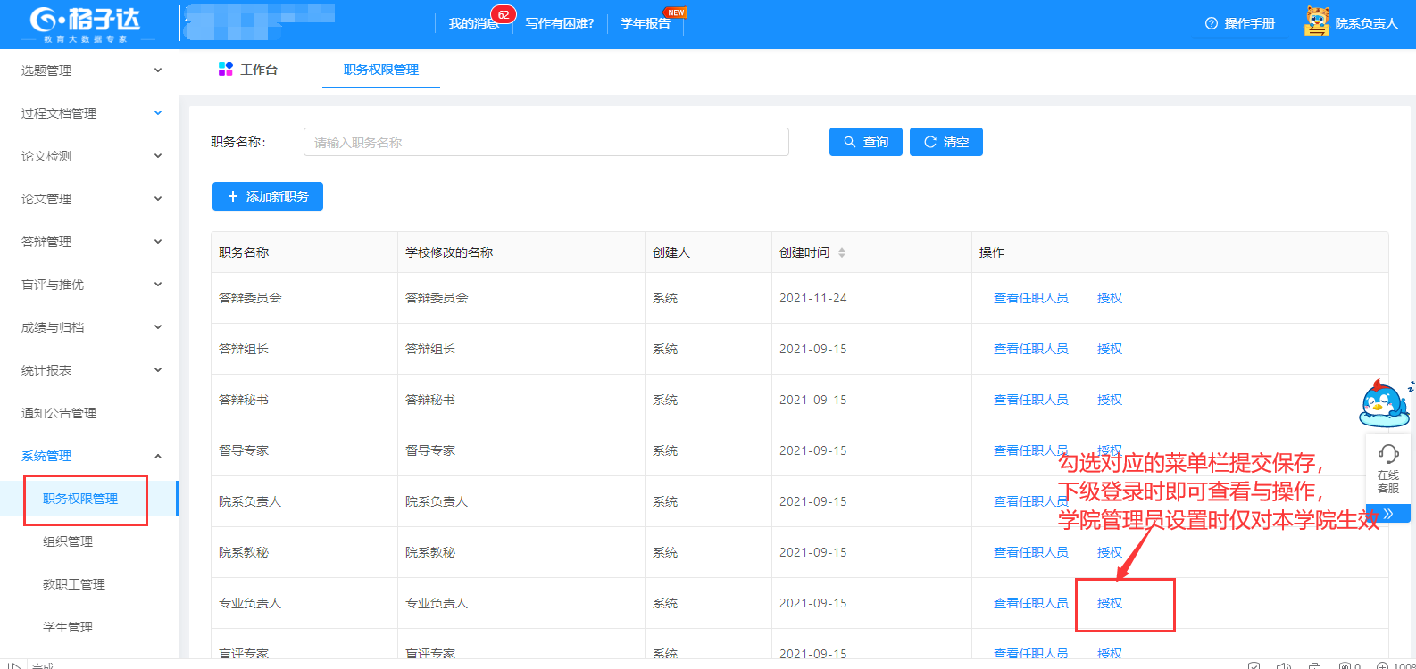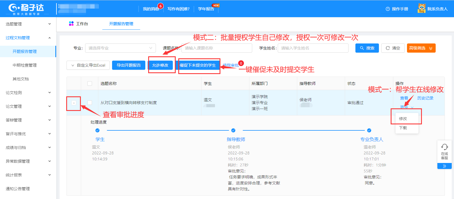 过程文档管理管理中可查看各学生具体的情况,对其进行监督管理并对其进行赋权赋权一次即可修改一次。