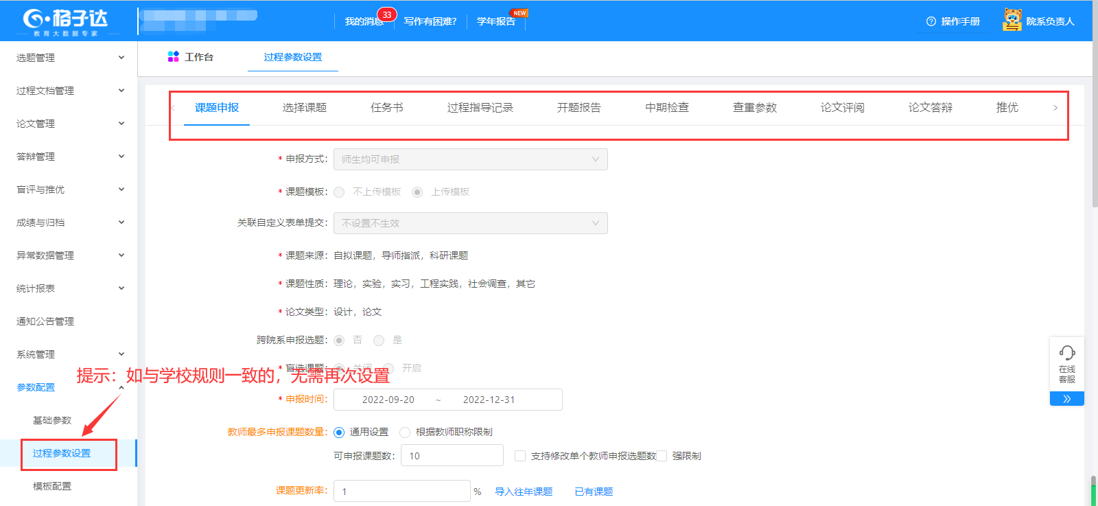 注意:如与学校标准一致,可不设置;院系参数与学校参数不一致时,以院系为准点击保持设置之后方可生效。