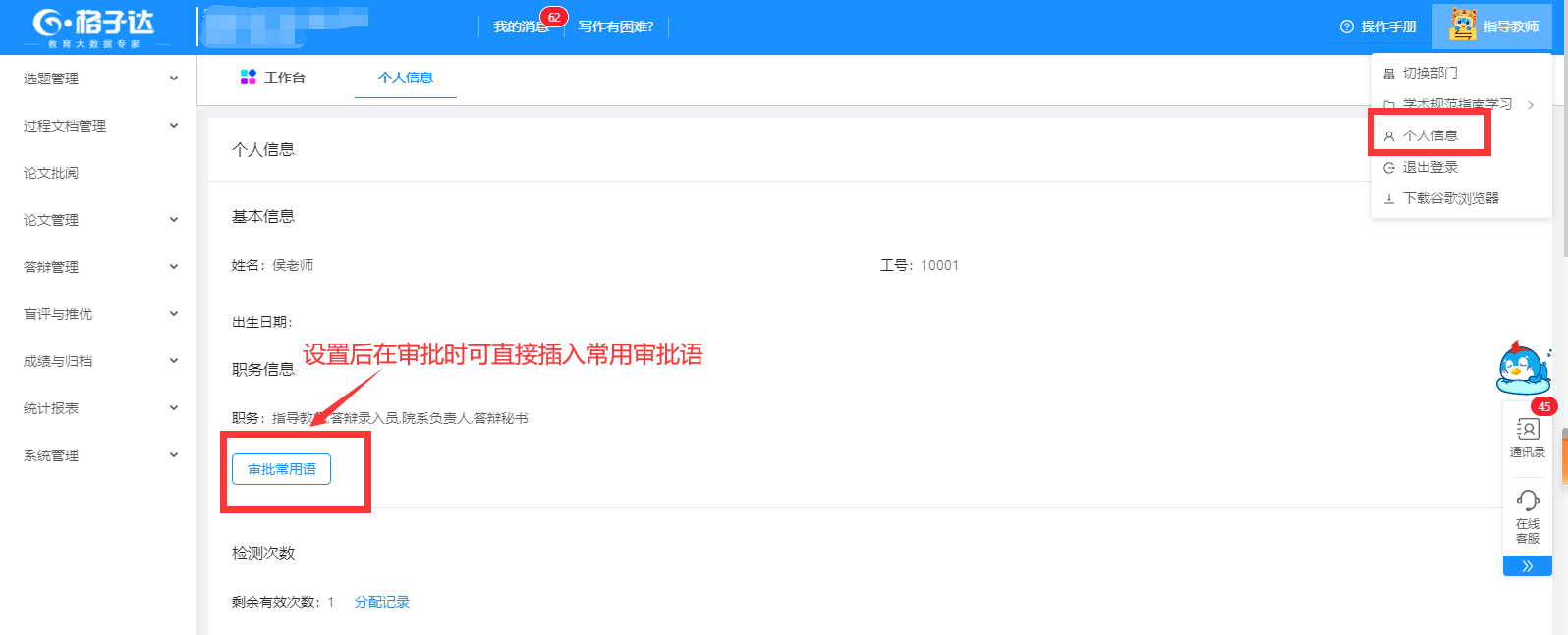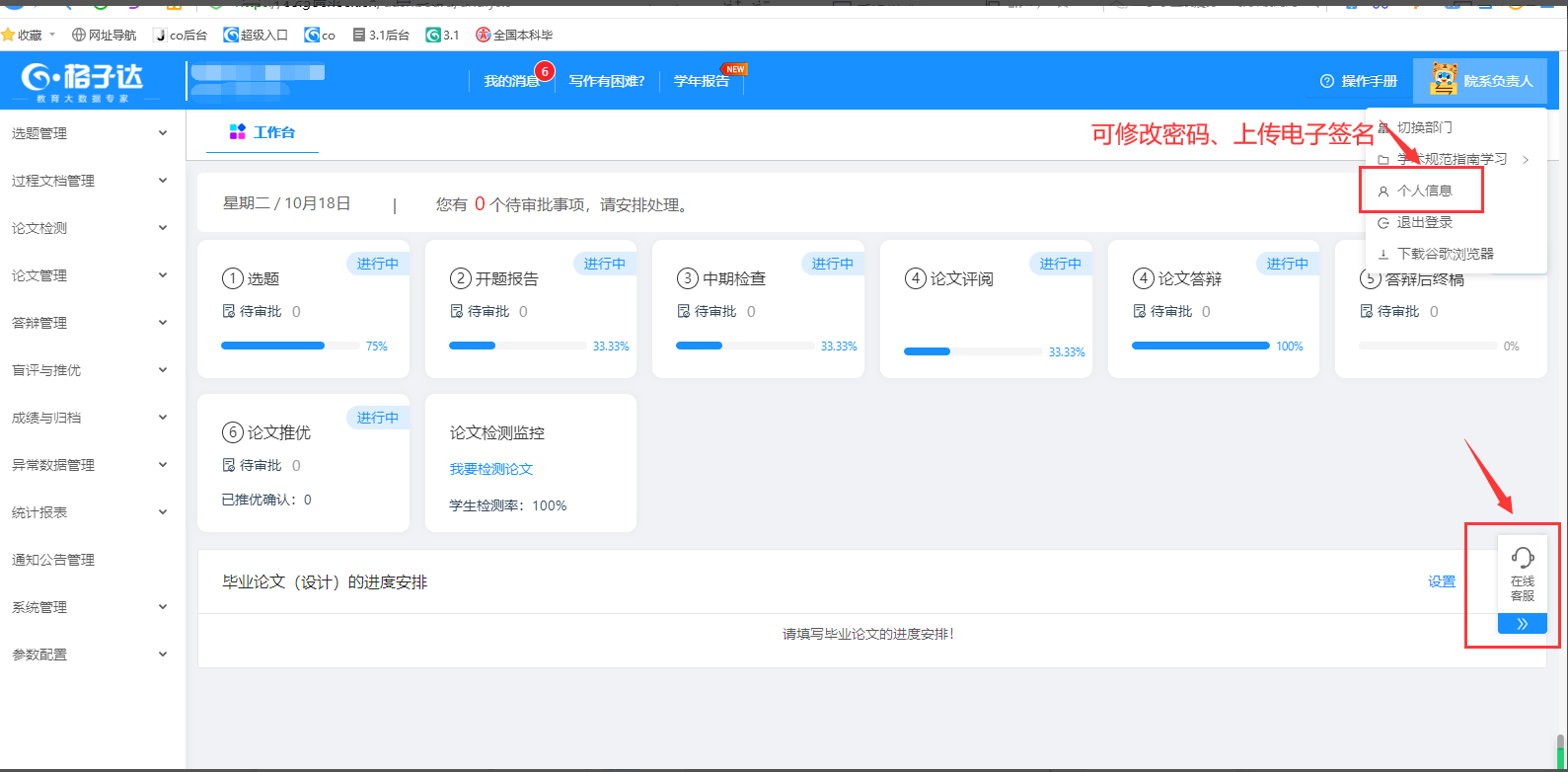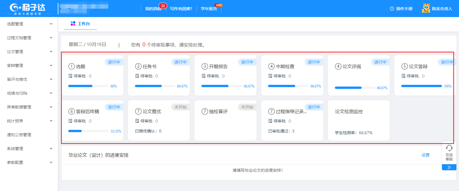 在【工作台】界面,可查看所有过程文档审批情况点击环节可打开毕设论文环节概况报表。